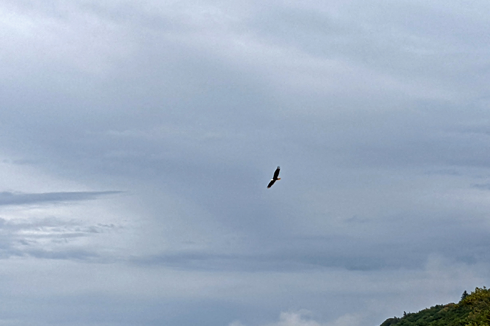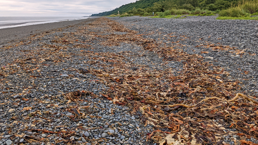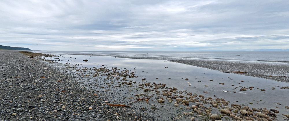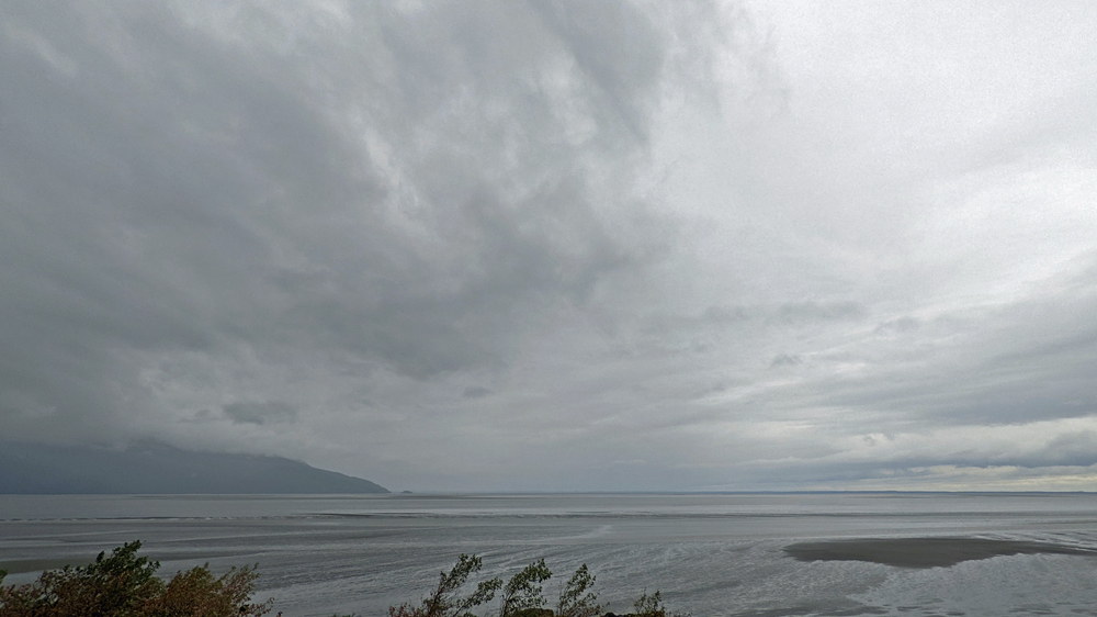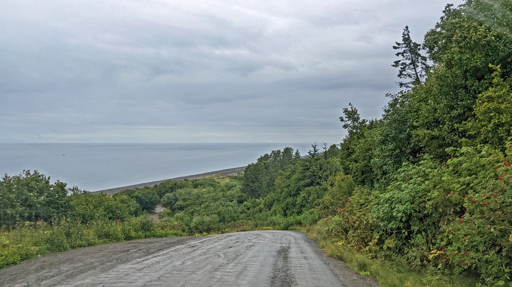 Am nächsten Morgen verabschieden wir uns von Gabi und Jürgen und fahren wieder auf den Sterling Highway, der nun bis zu seinem Ende in Homer der Küste folgt. So sieht es zumindest auf der Karte aus… Vom Cook Inlet bekommen wir nur wenig zu sehen, da zwischen Strasse und Meeresarm eine Art Küstenwall verläuft und/oder Bäume die Sicht verdecken… Aber verpassen tun wir eh nicht viel, denn die Wolken hängen immer noch tief und es ist grau und «grusig». Wir lassen auch die verschiedenen Sehenswürdigkeiten (Russisch-Orthodoxe Kirchen und Dörfchen sowie die gerade stattfindende Kenai Peninsula Fair) aus und fahren über eine sehr steile Strasse zum Whiskey Gulch Beach, einem «schönen Platz am Meer», den Silbylle und Hermann vor wenigen Tagen besucht und uns empfohlen haben. Nach Beschreibung im «Milepost» hätte man von der Küste aus einen Panoramablick auf die vulkanische Kette der Chigmit Mountains (Teil der Aleutischen Bergkette) auf der anderen Seite des Cook Inlet mit den aktiven Schichtvulkanen Mount Redoubt und Mount Iliamna, aber eben: tiefhängende Wolken lassen knapp einmal den Blick auf das Wasser zu… Trotzdem gefällt uns der Platz nicht schlecht. Wir beobachten den hohen Tidenhub, der weite Flächen des flachen Strandes freigibt, auf dem Möwen und Weisskopfseeadler in den angeschwemmten Kelphaufen nach Essbarem suchen. Unter anderem werden es auch hier immer wieder Karkassen filetierter Lachse angespült und die Luft riecht hier sehr stark nach verrotendem Fisch…