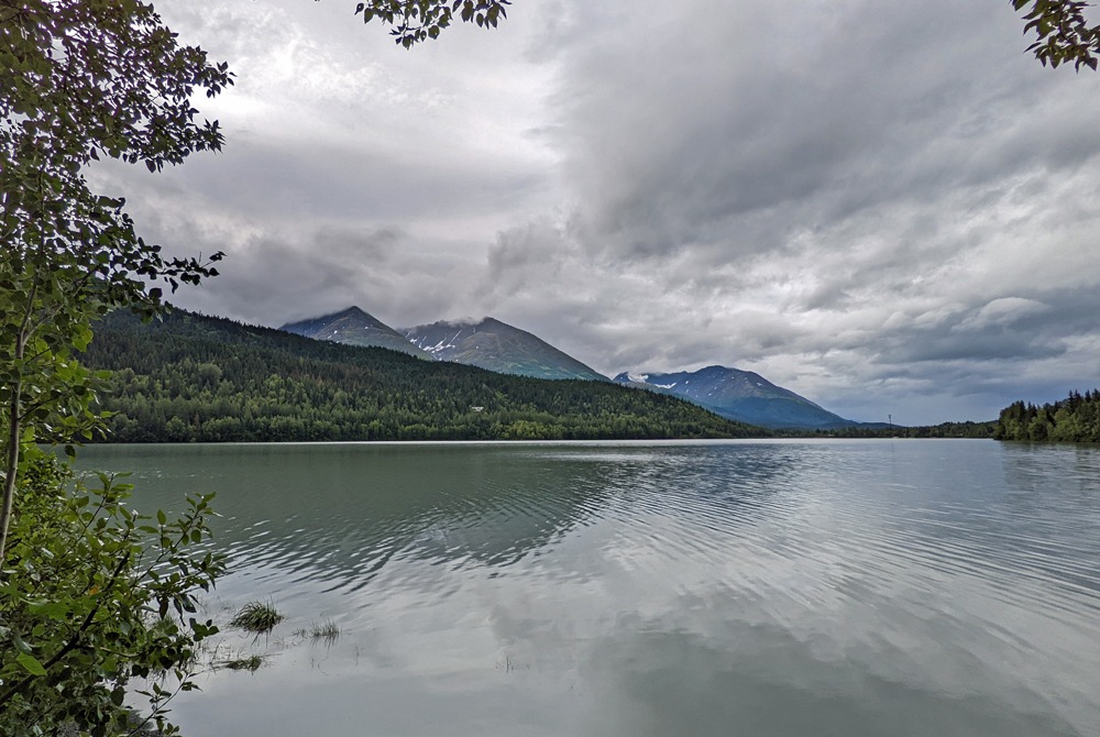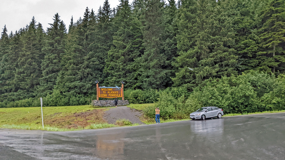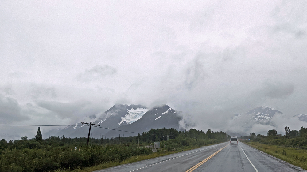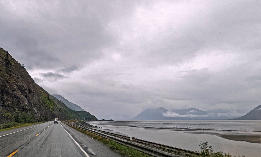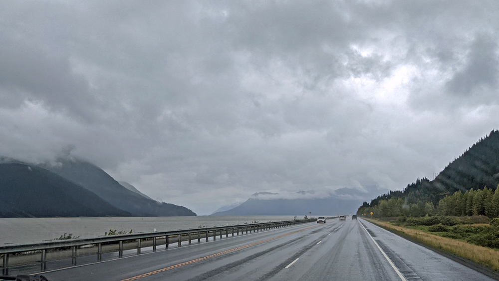 Bei Regen kommen wir auf die Kenai-Halbinsel und folgen dem Seward Highway weiter Richtung Seward. Auch das wäre eine schöne Strecke durch die Kenai-Bergkette, vorbei an verschiedenen Seen – wenn man etwas davon sehen würde…