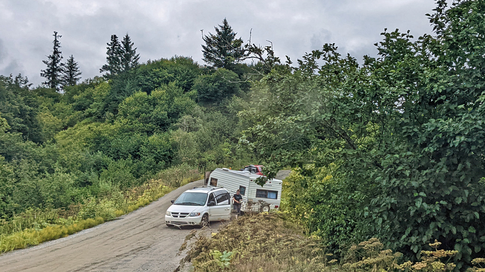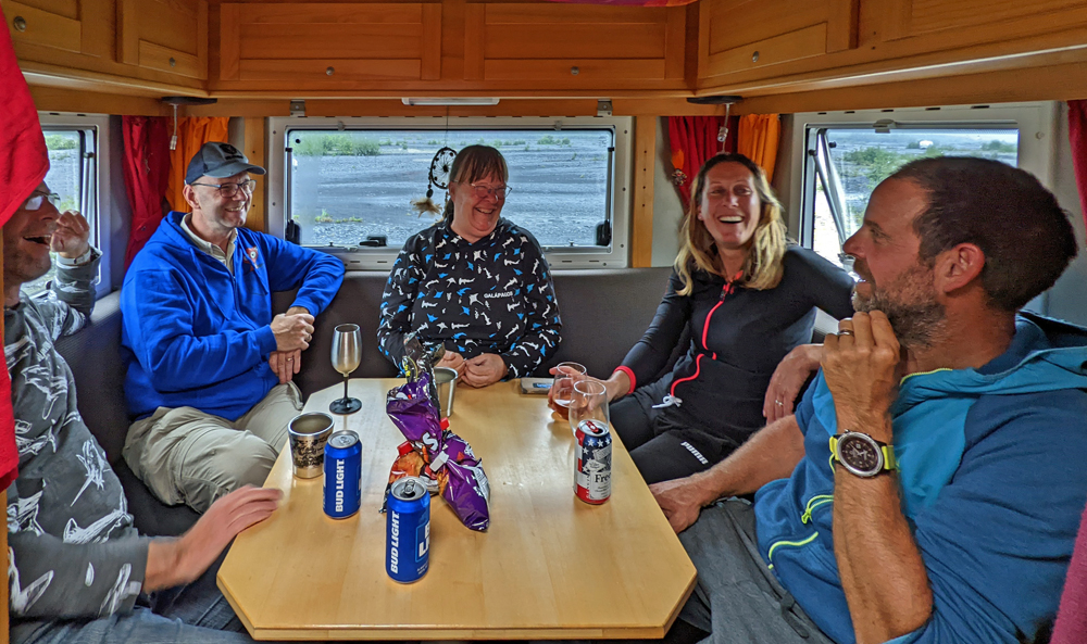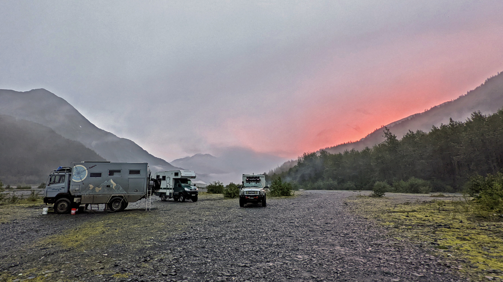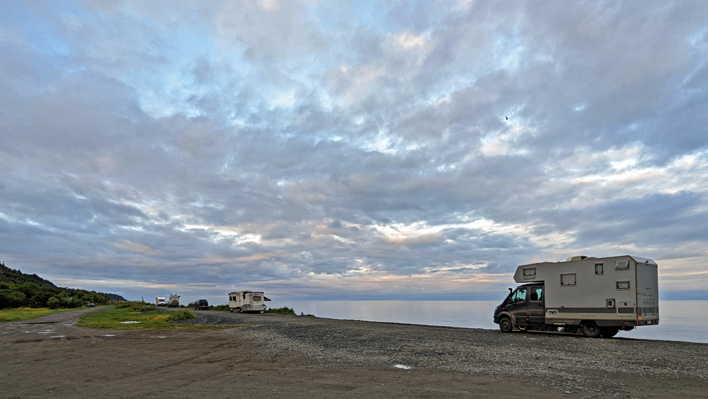 Ein kleines Stück weiter führt ein Strässchen durch den Wald auf die Sandbank – die schon gut besetzt ist! Überall Camper und Reisende! Wir suchen uns einen Platz aus – und entdecken auf dem Weg dorthin das D-Hai! Sibylle und Hermann stehen zusammen mit dem Whaly von Linda und Sandro (https://www.howis-web.ch/) und wir gesellen uns natürlich dazu! Whaly hatten wir bereits Ende Juni in Delta Junction gesehen, die beiden aber gerade verpasst. Sandro kocht feine Spaghetti für alle (danke!) und wir erleben wieder einen gemütlichen und feucht-fröhlichen Abend im D-Hai, während draussen der Sonnenuntergang hinter den Wolken für eine mystische Stimmung sorgt. Erneut wird es später – und erneut müssen Sibylle und Hermann am nächsten Morgen früh raus… Sie haben eine Bootstour von Seward aus gebucht, während wir ausschlafen können.