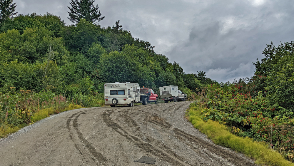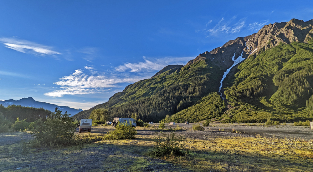 Kurz vor Seward biegen wir ins Tal des Resurrection River ab, wo man auf einer Sandbank übernachten kann. Auf dem Weg entdecken wir einen Pickup, der von der Strasse abgekommen ist. Der Herr ist nach eigener Aussage auf dem schmalen Ausstellplatz mit dem Rad auf die weiche Grasböschung geraten und abgerutscht. Sein Freund, dem das Auto gehört, ist auch schon vor Ort, doch nehmen sie unsere Hilfe gerne an. Ozy hängt den Pickup hinten an, zieht und schon steht er wieder auf der Strasse, wo er hingehört.