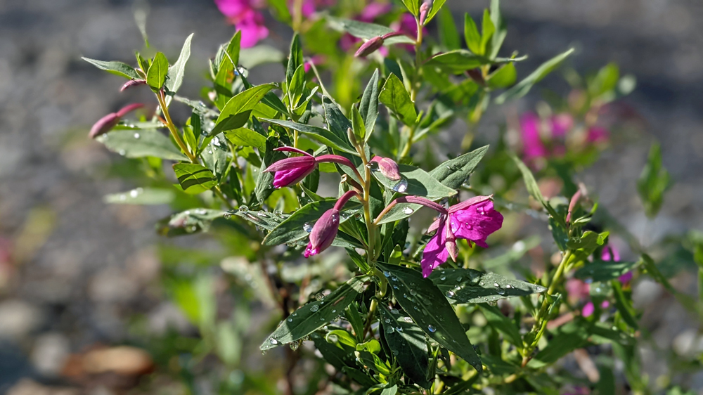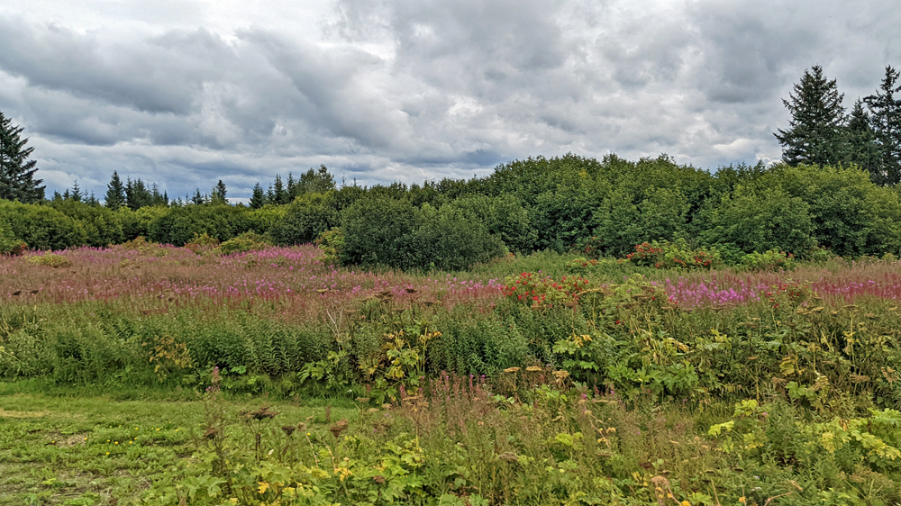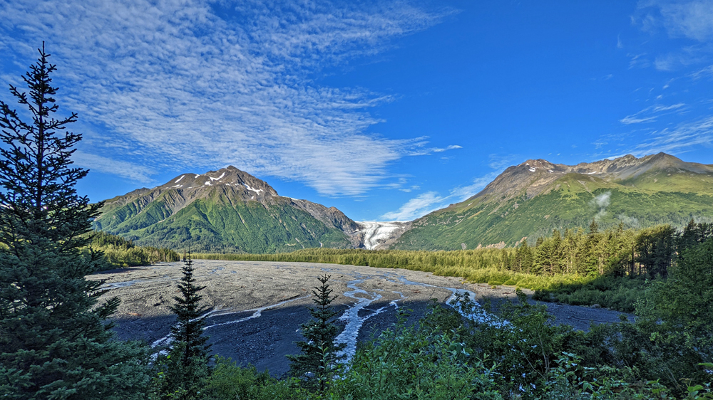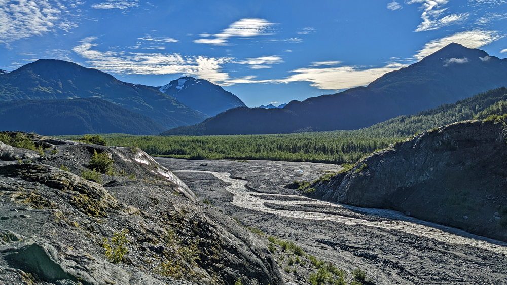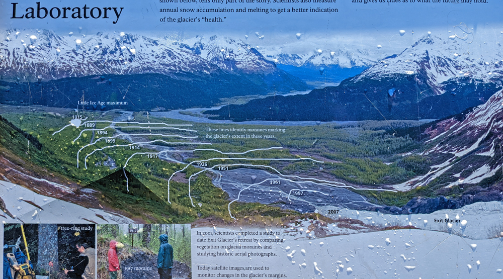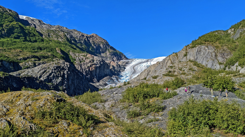 Allzu lange hält es uns heute Morgen aber auch nicht im Bett, denn es ist schönes Wetter! Ja! Sonnenschein und strahlend blauer Himmel!!! Genau das Richtige für einen Ausflug zum Exit Glacier! Der Gletscher ist eine der 40 Eiszungen, die vom rund 2’000 km2 grossen Harding Icefield ausgehen, das einen Teil der Kenai Mountains bedeckt. Der Exit Glacier ist Teil des Kenai Fjords National Parks (der einzige Teil, der mit dem Auto zugänglich ist) und man kann auf Trails diverse Aussichtspunkte auf den Gletscher und das Harding Icefield erwandern. Ich gehe den Gletscher von der Nähe aus angucken, schenke mir aber die steile Tageswanderung zur Eiskappe (im Gegensatz zu Linda und Sandro, die auch wesentlich sportlicher sind…). Der Weg zum Glacier Overlook ist sehr schön. Er führt zu einem grossen Teil durch den Wald, vorbei an blühenden Arktischen Weidenröschen, Holunder mit tiefroten Beerendolden und leuchtgrünen Moosteppichen. Immer wieder hat man Ausblicke auf die teils bewaldete Schwemmebene mit Resten der diversen Endmoränen, die glattgeschliffenen Felsen und natürlich nicht zuletzt auf den Gletscher selbst, dessen Ende sich aktuell in einem engen Canyon befindet. Für meinen Geschmack hat es hier schon wieder zu viele Menschen, aber der Gletscher ist ja auch ein Highlight.