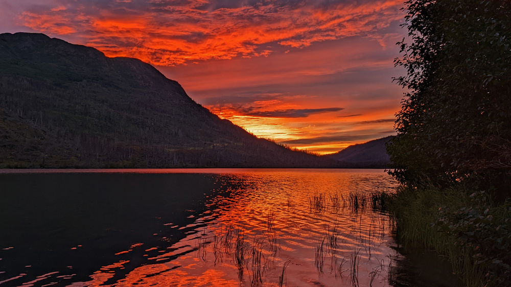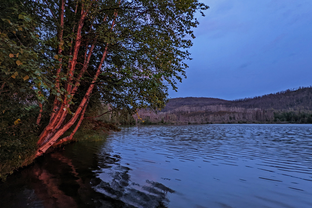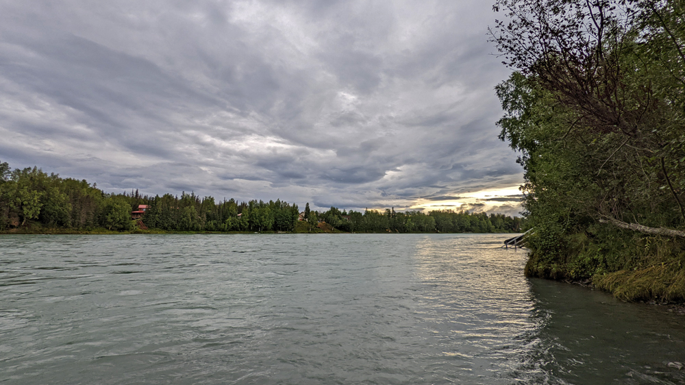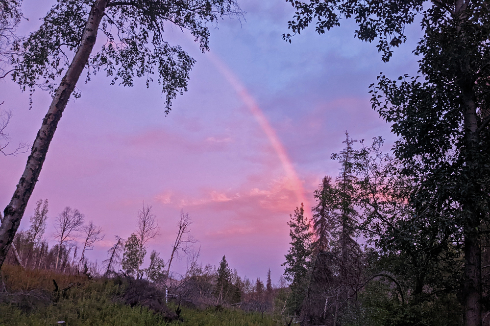 Bald biegen wir auf den Sterling Highway ab, ein Stück weit dem leuchtend blauen Kenai River folgt. Der Fluss ist berühmt für die Lachsfischerei und wir fahren zur Skilak Road, wo mir Sandro eine Stelle beschrieben hat, an der er ganz viele Lachse gefangen hat. Das möchte ich auch probieren! Wir finden den Parkplatz, von dem aus ein Pfad gute 300 m bis zum Fluss hinunterführt. Ich gehe erst mal «unbewaffnet», um die Situation anzugucken und stelle fest, dass der knappe Uferplatz schon mit Fischern besetzt ist. Zum von Sandro angegebenen Ort, der weiter flussabwärts liegt, gehe ich nicht, da die Super-Stelle selbst nur mit Wathosen zugänglich ist (und ich auch keinem Bären begegnen möchte). Leider dürfen wir hier nicht stehenbleiben, da im Kenai Wildlife Refuge das Überachten nur in designated campgrounds erlaubt ist. Aber nicht allzu weit entfernt am Jean Lake hat es einen solchen, wo man sogar gratis stehen kann. Hier können wir einen Loon beobachten und erleben einen der bisher dramatischsten und schönsten Sonnenuntergänge ever – und dazu sogar noch einen «Sonnenuntergangs-Regenbogen»! Absolut fantastisch! Der einzige Wermutstropfen ist, dass der Regenbogen der Vorbote des Regenwetters ist, das uns den Rest unserer Zeit auf der Kenai-Halbinsel begleiten wird…
