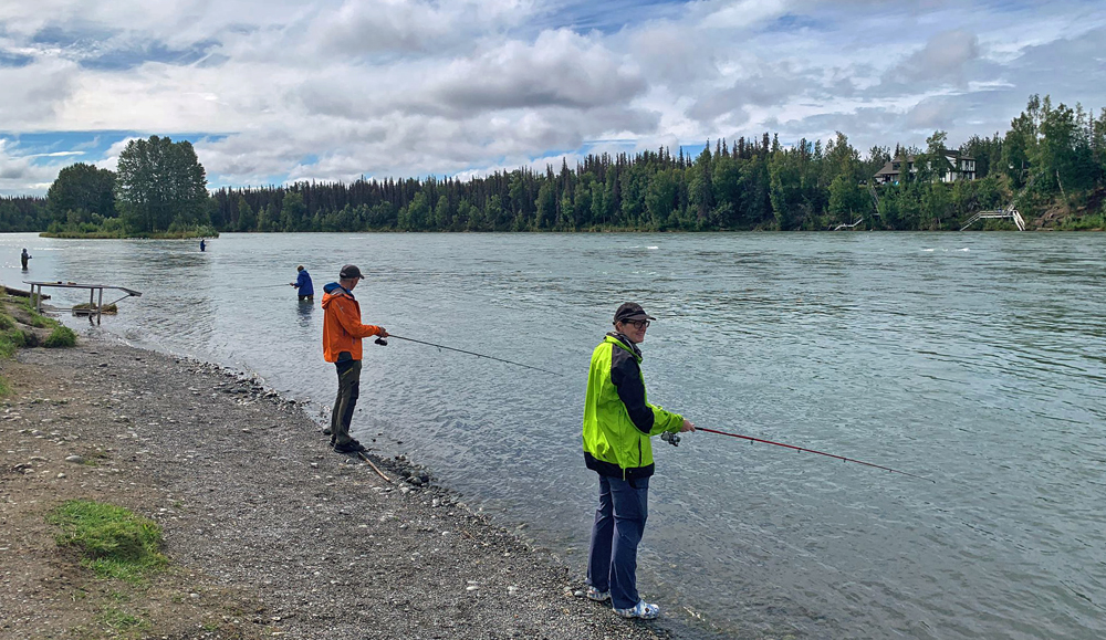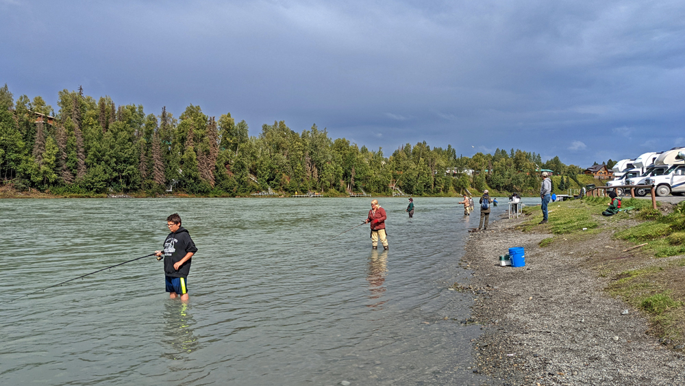 Dann halt ein weiterer Versuch in Soldotna, das wir nach etwa einer Stunde erreichen. Hier decken wir uns bei Fred Meyer mit Lebensmitteln ein und ergattern dann für zwei Nächte einen Platz auf dem grossen städtischen Centennial Campground (einer von zweien). Hier dreht sich alles ums Lachsfischen. Es gibt lange fish walks, dem Ufer entlang führende Wege, von denen aus immer wieder Treppen auf Fischerplattformen und in den Fluss führen. Dazu verschiedene Fischsäuberungsstationen, teils sogar mit fliessend Wasser, wo angeschrieben steht, dass man dann die Überreste (Innereien und ggf. Kopf und Skelett) in den Fluss werfen und nicht in den Abfalltonnen entsorgen soll (zum Schutz vor Bären und zur Rückgabe der Nährstoffe). Ich versuche auch hier wieder mein Glück. Zuerst von einer Fischtreppe, dann direkt von der Kiesbank am Ufer aus. Diese liegt in der day-use area, das heisst, man kann hier für ein kleines Entgelt auch herkommen, ohne zu campen. Davon wird auch rege Gebrauch gemacht. Ein Fischer reiht sich an den anderen und es ist schon fast schwierig, einen Platz zu finden. Aber ich möchte nochmals einen Lachs fischen! Ob der Kälte blau gefroren (und ohne Lachs) kehre ich einige Zeit später wieder zu unserem Camper zurück und erlebe eine freudige Überraschung: unsere Reisefreunde Gabi und Jürgen sind gerade angekommen! Sie haben sich bei Cabela’s in Anchorage ebenfalls ausgestattet und möchten sich hier im Lachsfischen versuchen!