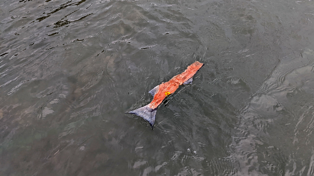 Wir gehen der Sache auf den Grund und erfahren zuerst einmal, wie das Fischen aktuell abläuft. Die Leute fischen mit Fliegenfisch-Rute, benutzen aber eine andere Technik: An der Schnur befindet sich ein Gewicht und etwa 1.80 davon ein recht grosser, einzelner Haken (#8), der mit farbigen Wollfäden oder auch nur einer farbigen Perle beködert ist (Dreifach-Haken sind erst ab Mitte August wieder erlaubt). Die Angler stehen am Ufer im Wasser und werfen dann mit einer halbkreisförmigen Bewegung über ihren Kopf in einem 90 °-Winkel nicht sehr weit aus (Ziel ist es, den Haken in die «sweet line», die Linie mit der wenigsten Strömung, zwischen Hauptströmung des Flusses und Gegenströmung dem Ufer entlang, zu bekommen, enlang derer die Lachse flussaufwärts ziehen). Dann führen sie die Angelrute mit der Schnur in einer halbkreisförmigen Bewegung vor sich durch das Wasser. Sobald sie einen Fisch am Ende der Rute spüren, geben sie einen scharfen Ruck – und haben dann den Fisch an der Angel. Wenn sie den Fisch an einer anderen Stelle als im Maul erwischen, müssen sie ihn wieder ins Wasser werfen (was ich eine unmögliche Regelung finde, da der Fisch dann ja verletzt ist…). Und auch sonst werfen sie die meisten Lachse wieder zurück, weil es «nur» Humpies (Pink Salmon = Buckellachse) sind, die kleinste und zahlreichste Pazifische Lachsart. Die Angler hier haben es auf Coho Salmon (Silver Salmon = Silberlachs) abgesehen (die ihren run noch nicht so richtig gestartet haben) und möchten ihre Fangquote nicht mit Humpies füllen, die angeblich minderwertiges Fleisch haben (vermutlich gegenüber Silber- und Königslachs, denn zumindest im Meer sind sie eine sehr wichtige Art für die Fischerei und werden zu Konserven oder auch Rauchlachs verarbeitet).