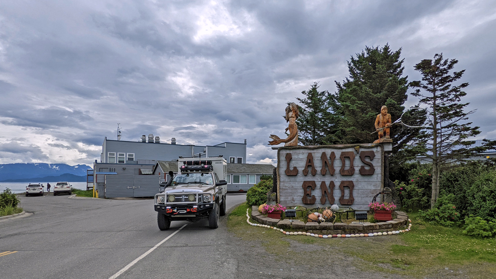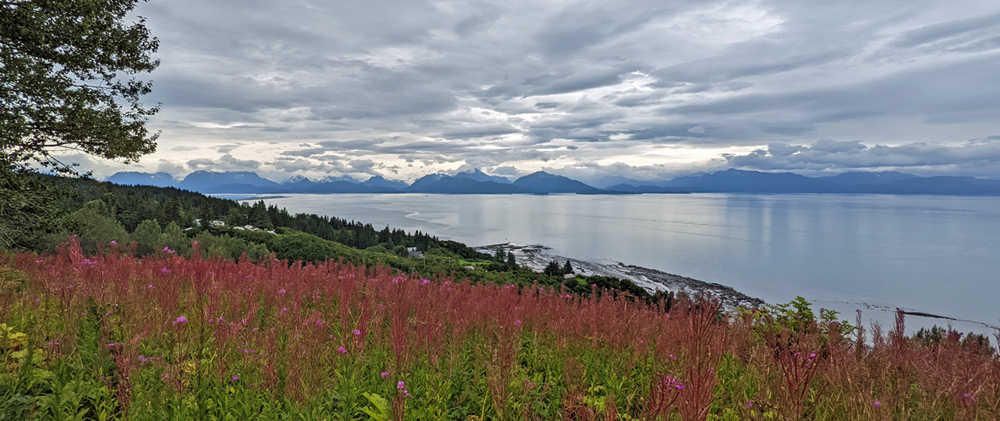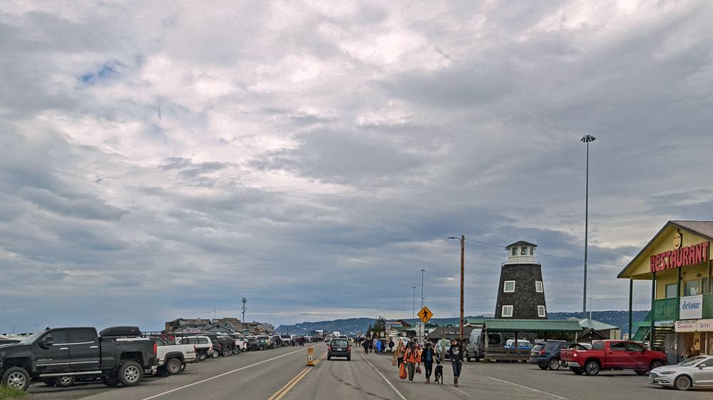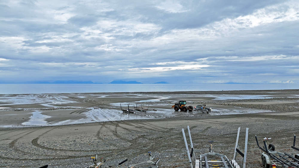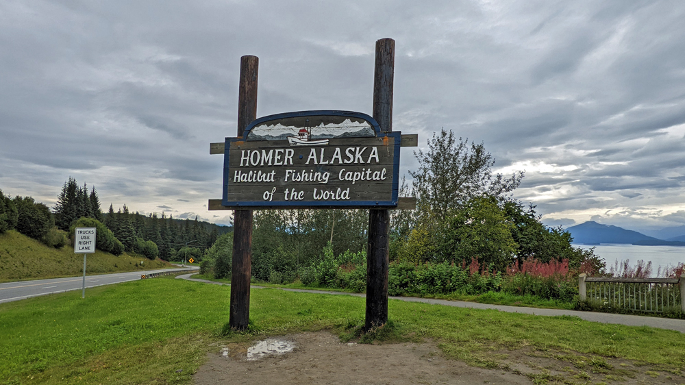 Auf dem Weg nach Homer fahren wir zuerst zum Anchor Point, dem westlichsten Punkt Nordamerikas (zugänglich über ein durchgehendes Strassennetz). Die Tafel und damit den aller, allerwestlichsten Punkt verpassen wir irgendwie (wäre beim Halibut Campground), das heisst, wir müssen nochmals hierherkommen… 😉 Dafür bekommen wir beim Anchor Point eine tractor boat launch mit: Das sich auf dem Trailer befindliche Boot inkl. Leuten drin wird von einem grossen Traktor übers Watt gezogen und dann am Meer zu Wasser gelassen.  Aufgrund der grossen Gezeitenunterschiede und des flachen Strandes die einzige Möglichkeit, jederzeit ein Boot ein- oder auszuwassern… Wir beobachten noch einen Weisskopfseeadler und sein Junges (eigentlich schon ein Teenager), schwatzen mit einem interessanten Schweizer Reisenden-Paar (wir haben leider die Namen vergessen. Er ist gehbehindert und war trotzdem mit seiner Frau und ihrem angepassten Van schon in Asien und an vielen anderen Orten) und fahren dann weiter auf dem Sterling Highway Richtung Homer. Vom Aussichtspunkt aus, der mit wunderschönen Blumenbeeten dekoriert ist, sieht man den Homer Spit, eine sieben Kilometer lange Landzunge, deren Ende zugleich das südliche Ende des Sterling Highway markiert. Wir bekommen ausserdem fast eine Idee, wie spektakulär die Gegend bei klarem Himmel und Sonnenschein sein muss…