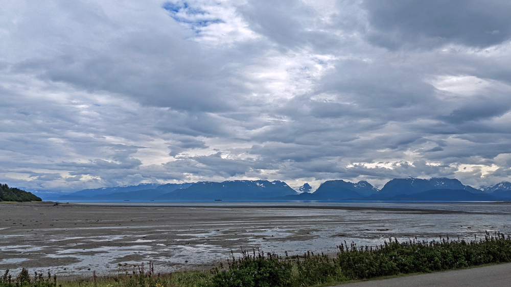 Am nächsten Morgen starten wir Richtung Süden. Beim Abfahren treffen wir die (weitgereisten) Brigitte und Daniel mit ihrem Bremach T-Rex und tauschen und angeregt über unsere Reisen aus. Danach folgen wir dem Turnagain Arm des Cook Inlet, der berühmt ist für seine landschaftliche Schönheit, eine Bore Tide (Gezeitenwelle) und nicht zuletzt für die Sichtung von Belugawalen im Juli und August. Ersteres können wir uns noch so knapp vorstellen, von den beiden anderen Sehenswürdigkeiten bekommen wir nichts mit, weil uns das Wetter einfach zu grusig ist, um an einem der Aussichtspunkte stehenzubleiben. Immerhin reissen die Wolken gerade noch so weit auf, um uns einen kleinen Blick auf den Portage Glacier zu erlauben.