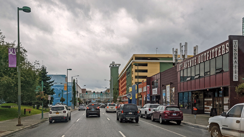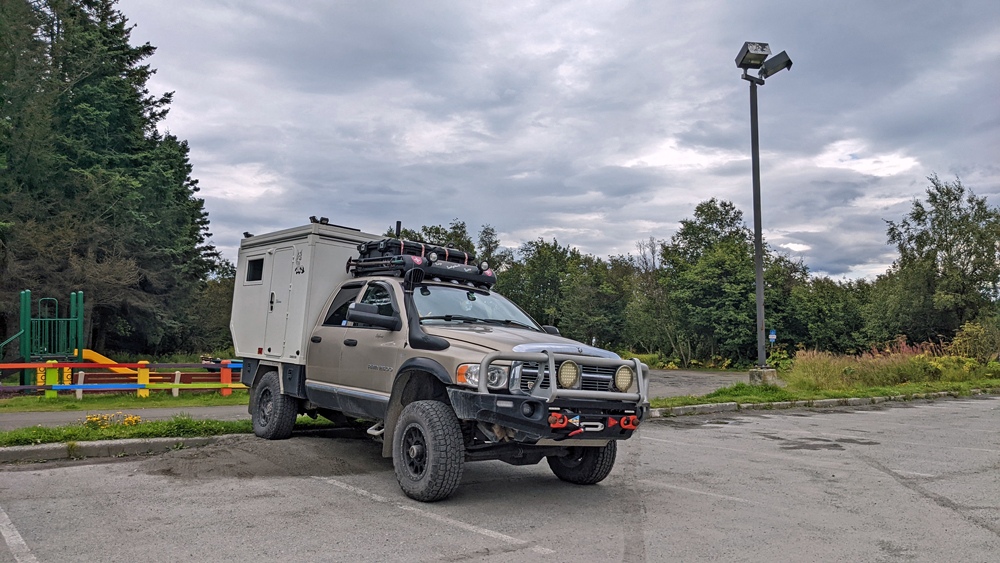 Am nächsten Mittag ziehen wir weiter (am Morgen musste ich natürlich nochmals fischen… 😉). Es ist 13 °C und so richtig «grusig». Wir fahren nicht sehr weit, nur bis Anchorage. Auf dem Weg benützen wir die Gelegenheit, bei einer Vitus-Tankstelle in Chugiak zu duschen (die drei Duschen befinden sich gleich im hauseigenen Waschsalon, was wir uns für die Rückfahrt merken).