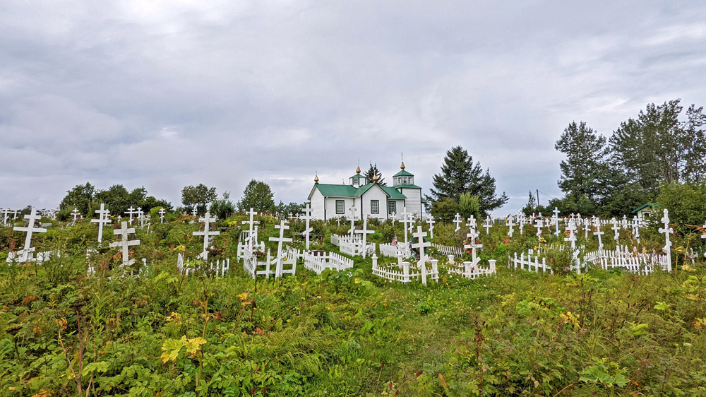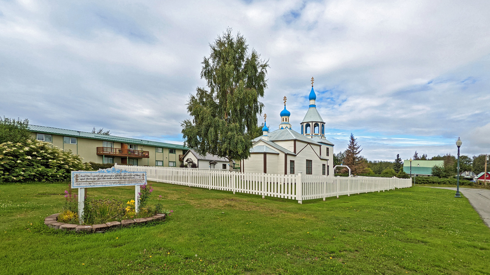 Am nächsten Tag fahren wir wieder die Küste hoch, mit einem Abstecher zur Russisch-Orthodoxen Kirche «Heilige Verklärung unseres Herrn» bei Ninilchik und nach Kenai, wo es ebenfalls eine schöne Russisch-Orthodoxe Kirche («Heilige Aufnahme der Jungfrau Maria in den Himmel») sowie weitere historische Gebäude zu betrachten gibt. Das Wetter ist heute etwas besser, was alles sehr viel freundlicher macht.