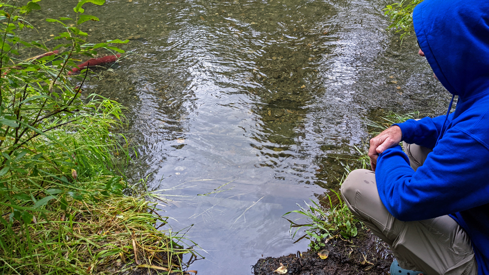 Wir möchten mal noch Lachse sehen und versuchen unser Glück in Cooper Landing, wo der offizielle Fussweg entlang des Flusses aber komplett überwachsen ist. Sibylle, denen wir hart auf den Fersen sind, gibt uns auf Nachfrage den Tipp, zum Moose Creek zu fahren. Also nochmals ein Stück auf dem Seward Highway Richtung Seward und auf einem Pfad durch den Wald bis zum Bach, wo wir tatsächlich einige Rotlachse (Sockeye) beobachten können! Allerdings scheinen dies die letzten Nachzügler zu sein, denn ihre Bewegungen sind schon sehr müde, viele haben ihre leuchtende rote Farbe teilweise verloren und es liegen auch etliche tote Lachse im flachen Wasser, was das ganze irgendwie noch beeindruckender macht.