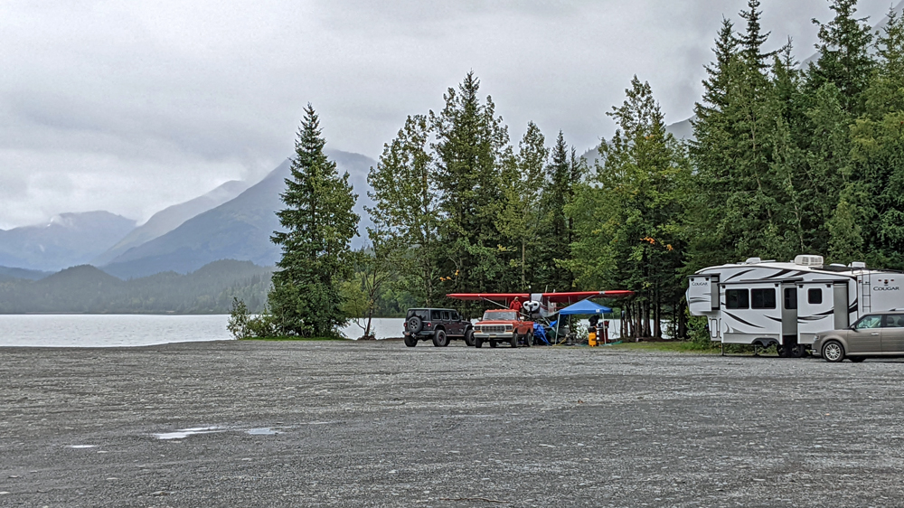 Mittlerweile ist es schon recht spät und das Wetter wird auch immer schlechter, weshalb wir gleich am nahen Upper Trail Lake bleiben, wo man inoffiziell stehenbleiben kann. Wir sind nicht ganz die einzigen und zu unserem Erstaunen reparieren hier unsere Nachbarn mal eben ihr Wasserflugzeug…