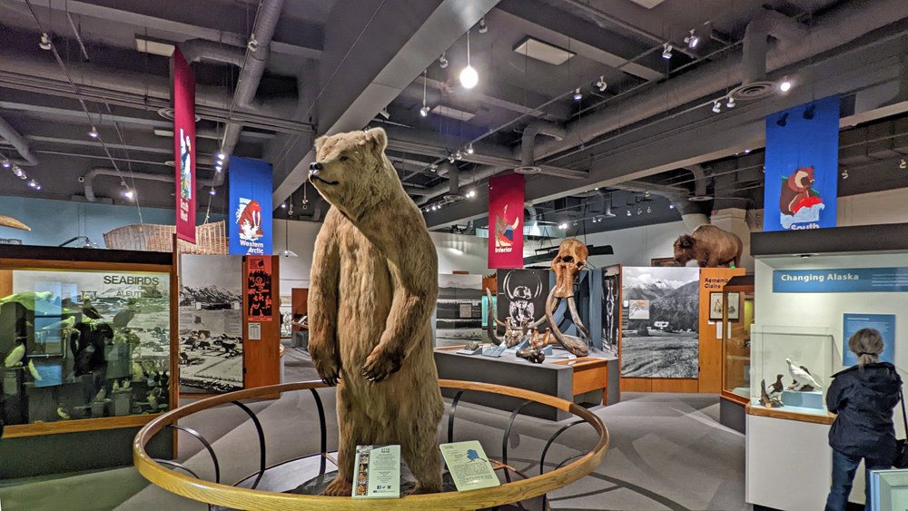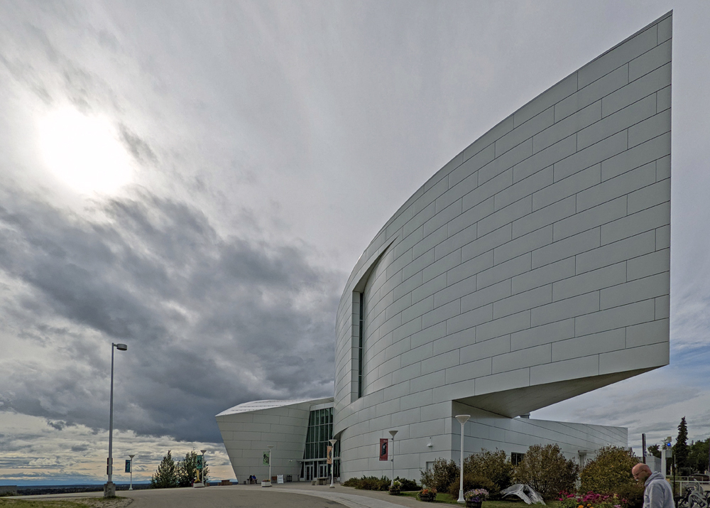 Nach dem Baden in der heissen Quelle sehr entspannt gucken wir am Donnerstag in Fairbanks das Museum of the North an, das durch seine Architektur aus dem Universitätscampus hoch über Fairbanks hervorsticht. Die Ausstellung ist schön gemacht, wenn auch für mein Empfinden von den Informationen her etwas überladen und unübersichtlich (die Hauptausstellung, die Gallery of Alaska, befindet sich in einem grossen Raum, der in fünf Unter-Ausstellungen zu den einzelnen Regionen von Alaska unterteilt ist, in denen jeweils Infos zu Natur, Geologie, Landschaft, Menschen und Geschichte sowie Einzelthemen gegeben wird). Ich bin so überfrachtet, das ich die anderen Ausstellungen (u.a. die Kunstgalerie) nicht mehr schaffe; auch zeitlich nicht: seit 21. August ist «Winter» und das Museum macht um 17.30 h zu. Und in den Museumsshop muss ich natürlich auch noch…