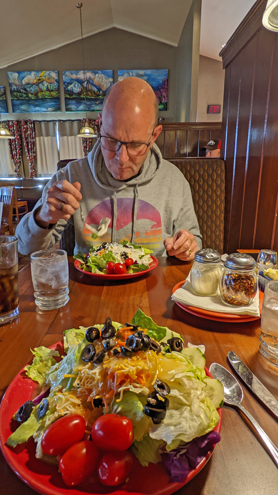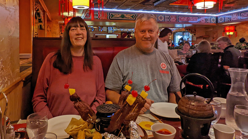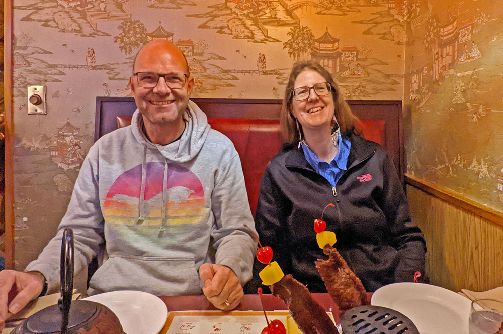 Nach einem Ausflug zu Sportsman’s Warehouse in Fairbanks, wo wir noch ein paar Kleinigkeiten besorgen, treffen wir uns mit unseren Freunden Penny und Don gleich in North Pole vor dem Pagoda. Heute ist irgendwie ein besonders beliebter Abend und wir müssen ein Weilchen warten, bis wir einen Tisch bekommen. Aber in guter Gesellschaft macht das ja nichts!