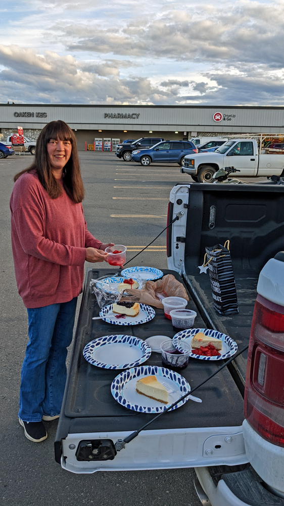 Wir geniessen zum Abschluss wieder eine feine Pu Pu Platter und Ozy und ich teilen uns diesmal ein Hauptgericht. Allzu viel sollten wir sowieso nicht essen, denn Kayla hat Penny als Abschiedsgeschenk Stücke selbst gebackenen – und absolut sensationellen – Cheesekaces mitgegeben, inkl. verschiedene Beerensaucen, die wir als Dessert auf dem Parkplatz verspeisen. Was für ein schöner Abschluss unserer Zeit in Alaska!
