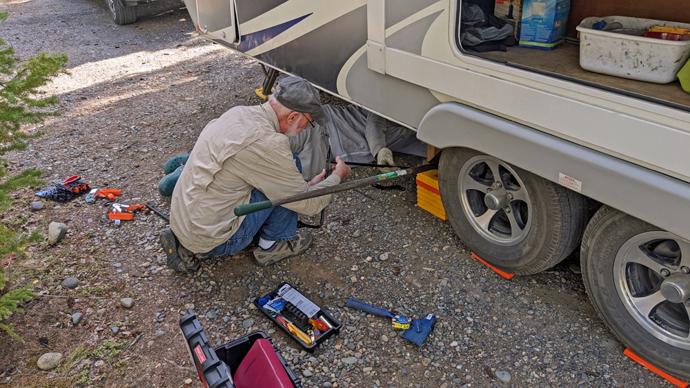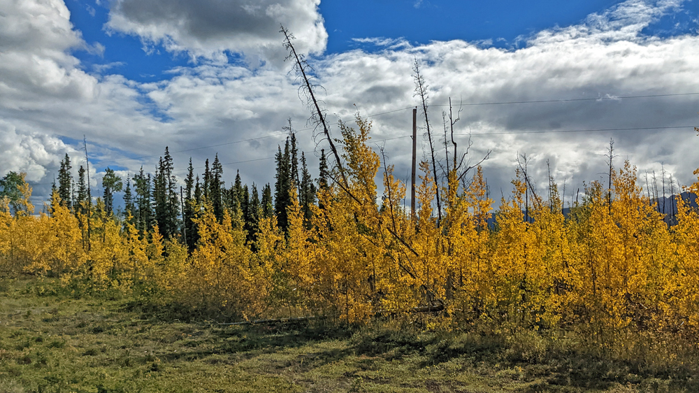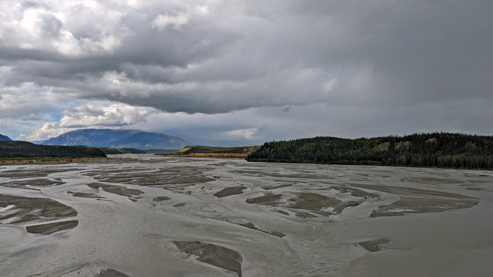 Wir bleiben zwei Nächte auf einer Kiesbank am Salcha River, wo wir den vorbeifahrenden Propellerbooten zusehen (und -hören…) können. Das Wetter wird definitiv herbstlich, mit tiefhängenden Wolken. Auf der Fahrt nach Tok klart der Himmel wieder auf und wir können das goldene Leuchten der ersten so richtig verfärbten Bäume geniessen. In Tok übernachten wir wieder auf dem Alaskan Stoves Campground, der uns auf der Hinfahrt schon so gut gefallen hatte. Wir kommen zufällig ins Gespräch mit Larry, der ganz unglücklich ist, weil der Wassertank seines Trailers durch die rumpeligen Strassen heruntergefallen ist. Jetzt muss er bis Anfang nächster Woche auf eine Reparatur warten und hätte doch eine Campsite in einem Nationalpark reserviert. Ozy guckt sich die Sache aus der Nähe an. Eine Halterung ist gebrochen, aber es lässt sich reparieren! Mit Hilfe von Larry und einem Wagenheber schafft er es, den Tank wieder in Position zu bringen und mit einigen, von Larry dafür in Tok erstandenen Ratschen-Zurrgurte zu fixieren. Das wird für die Heimreise reichen! Larry ist überglücklich und bedankt sich mit einer Geldspende – die wir dankbar gleich in ein feines Znacht bei Fast Eddie’s investieren.