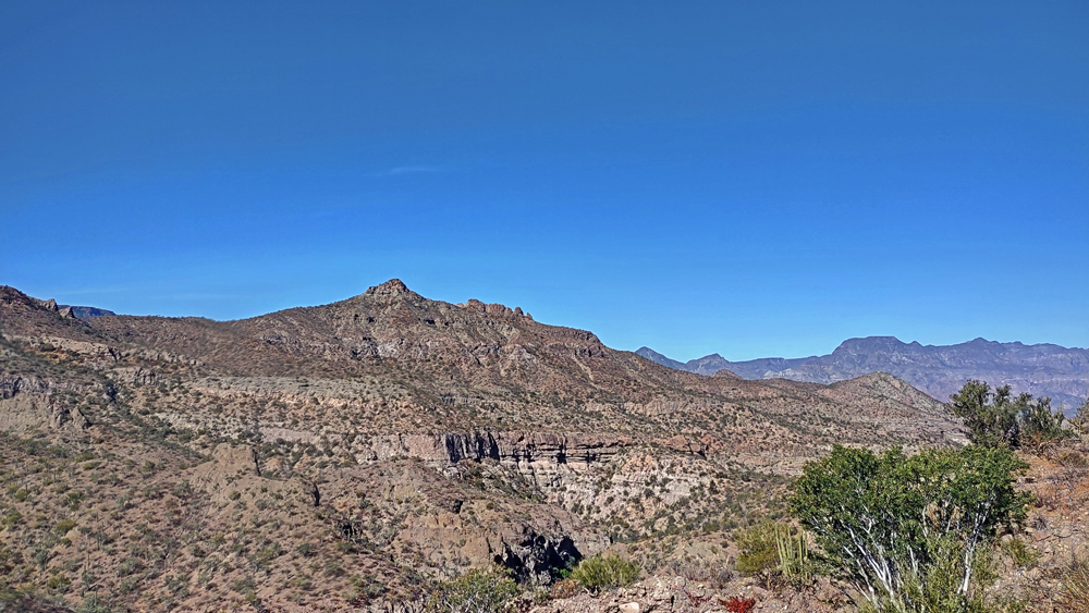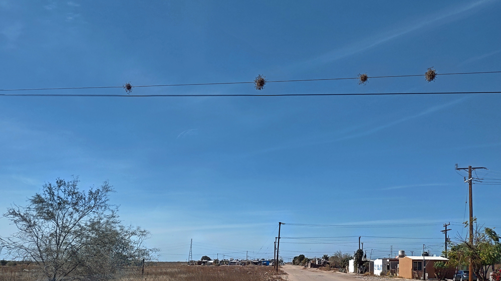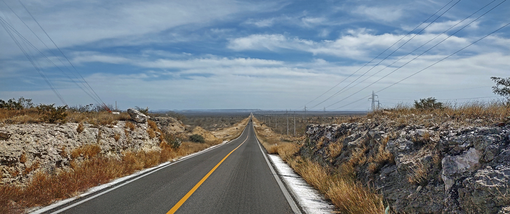 Die seit 2020 ausgebaute MEX 5 führt uns zunächst ein gutes Stück an der Küste entlang. Wir passieren einige Resorts in verschiedenen Stadien des Nicht-, Auf- und Abbaus. Dann biegt die ab Puertecitos neu gebaute Strasse in Richtung Inland ab und wir fahren durch schöne Kakteen- und Felslandschaften und vorbei an blühenden Agaven, bevor wir bei Chapala wieder auf die MEX 1 treffen, auf der wir 2019 in den Süden gefahren waren. Die Küstenebene westlich der Sierra ist noch gleich langweilig wie letztes Mal, dafür wird man – als Gringo – dieses Mal am Landwirtschafts-Checkpoint an der Grenze zur Baja California Sur nur aufgehalten, um 20 MEX bzw. 1 USD zu bezahlen, ohne, dass das Auto kontrolliert oder desinfiziert würde… (der «Beamte» erscheint uns auch eher wie jemand, der sich so ein Auskommen geschaffen hat…).