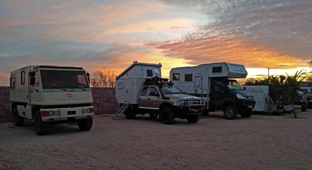 Nach diesem schönen Erlebnis bleiben wir noch zwei Tage in Loreto und fahren dann nach La Paz, wo wir uns wieder mit unseren Reisefreunden Sibylle und Hermann treffen wollen (das letzte Mal hatten wir im Herbst in Dawson City einige Tage miteinander verbracht). Sie sind schon länger hier und kennen all die schönen Orte auf der Baja. Wir werden die nächsten rund zwei Wochen zusammen reisen und dank Ihnen sozusagen ein «best of southern Baja» erleben dürfen (wir waren im 2019/20 ja nur bis Agua Verde gekommen). Als wir auf dem Campestre Maranatha, wo uns die beiden netterweise einen Platz reserviert haben, ankommen (auch hier ist es wegen des am Wochenende stattfindenden Carnevals gut voll), erleben wir gleich noch eine freudige Überraschung: da steht nicht nur das «D-Hai» von Annens, sondern auch noch der Duro von den «Dubus» Claudia und Thomas! Was für ein schönes Wiedersehen! – die beiden hatten wir im April 2021 das letzte Mal getroffen.
