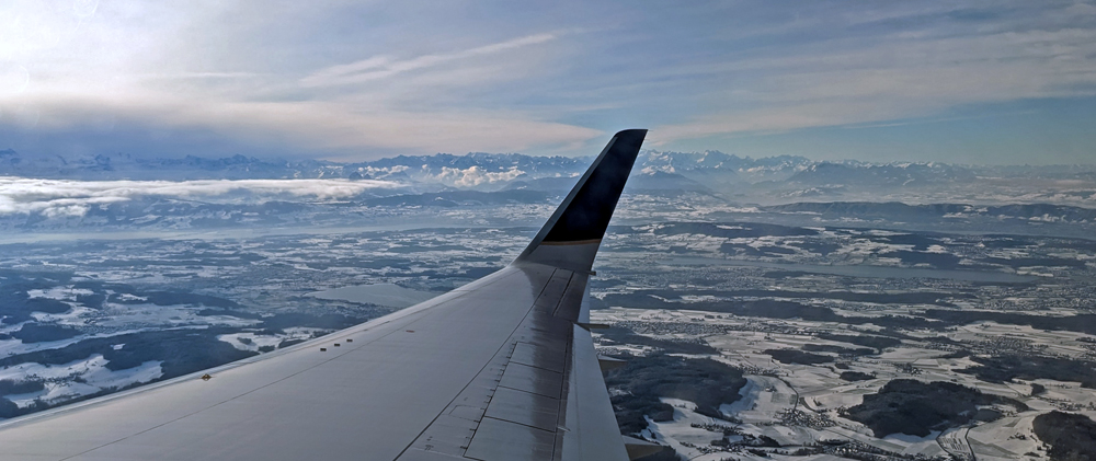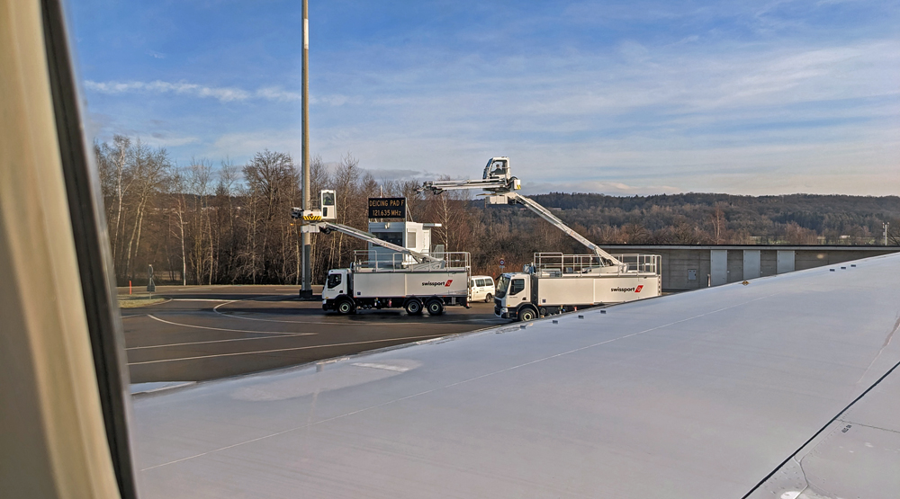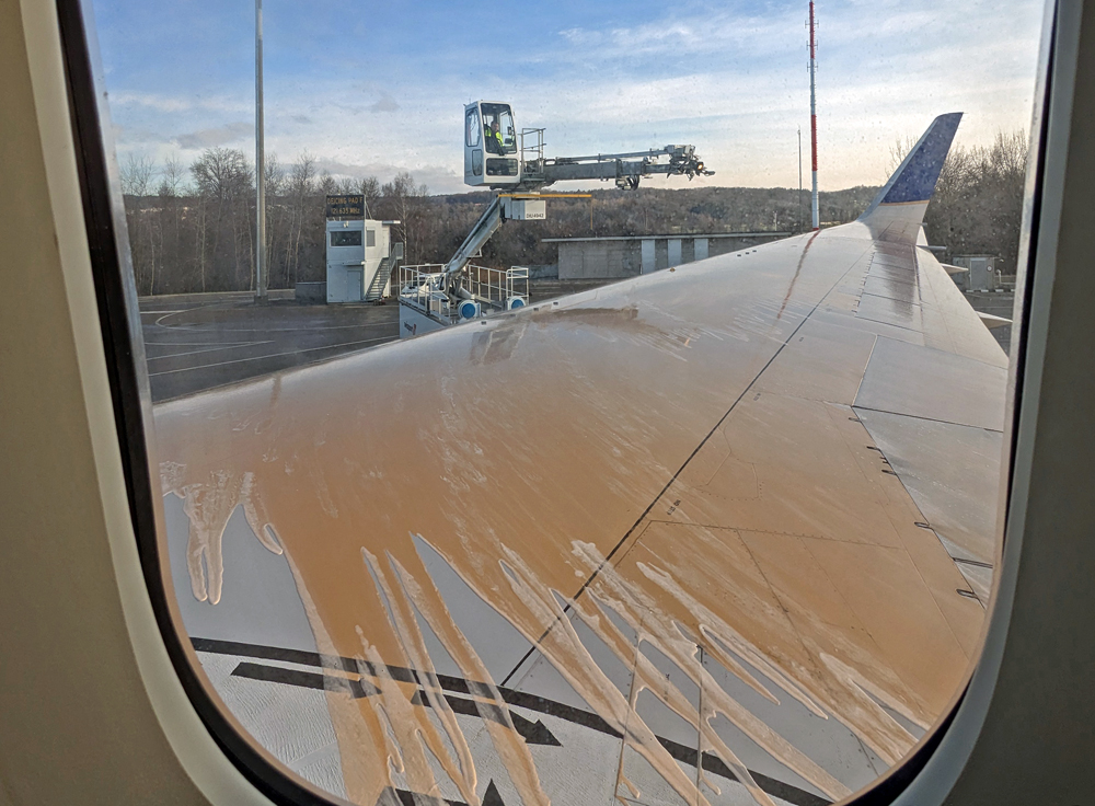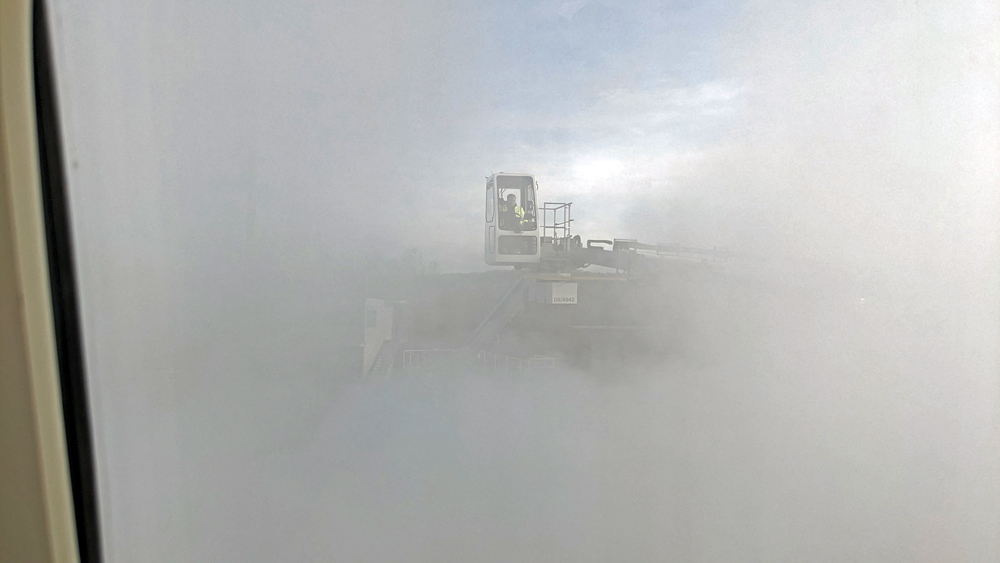 Endlich im Flugzeug verzögert sich der Abflug noch mehr, da zuerst noch die Tragflächen enteist werden müssen. Dafür rollt das Flugzeug zu einem speziellen Platz, wo wir – mit Logenplatz direkt über dem Flügel – fasziniert zuschauen, wie die Tragflächen von speziellen Fahrzeugen sorgfältig mit dem orangen Enteisungsmittel eingesprüht werden.