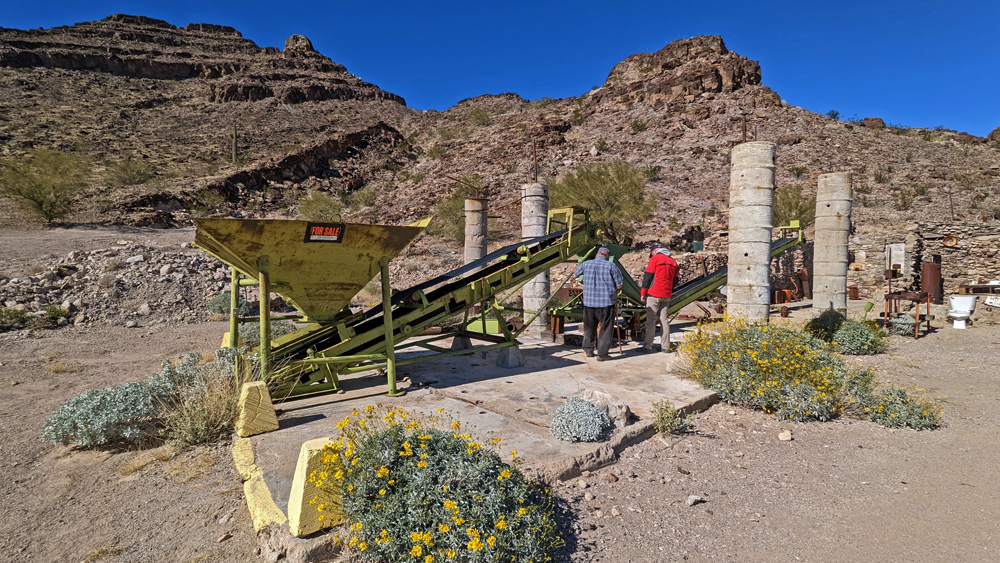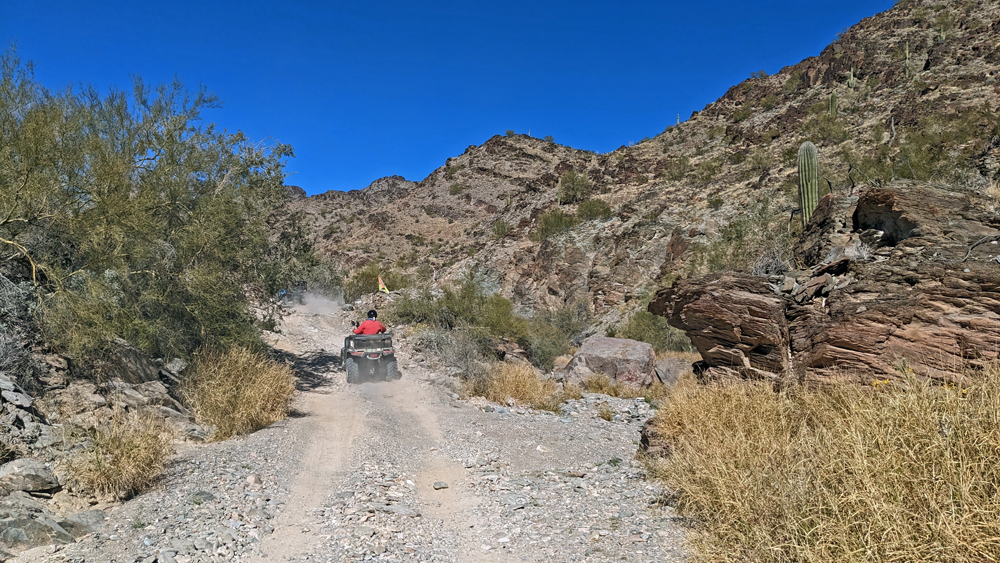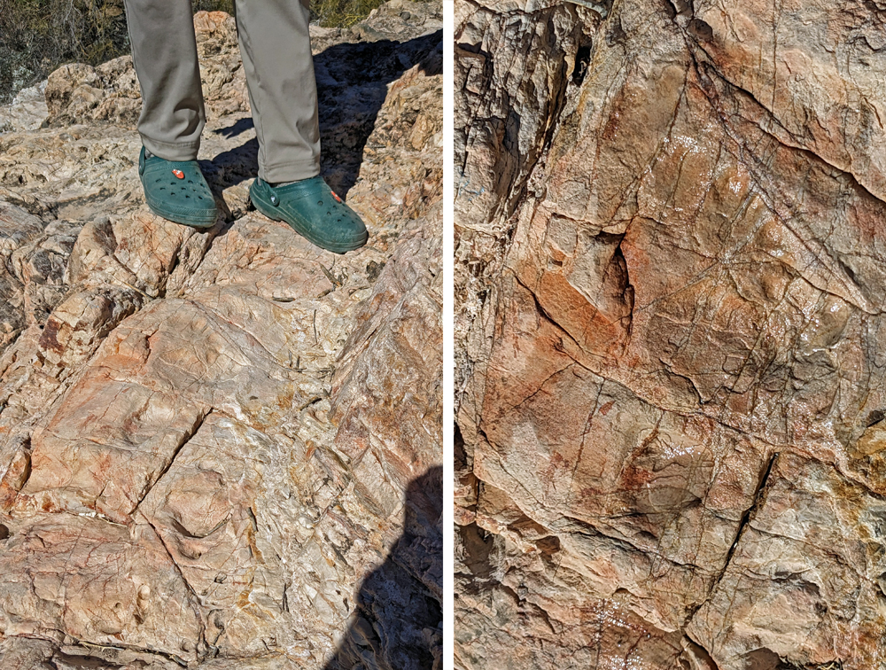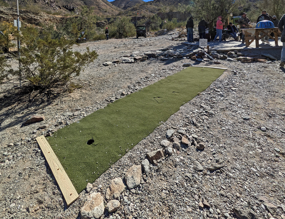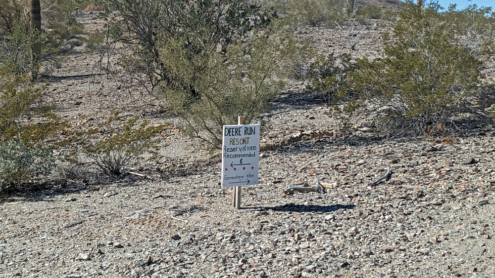 An einem Tag ist es aber doch mal so ruhig und schön, dass wir einen Ausflug in die Umgebung mitmachen können. Bill ist so lieb und leiht uns sein (neues) Side-by-Side und unsere Freunde, die sich hier natürlich super auskennen, zeigen uns (prä-)historische Petroglyphen und Mörser, den «Indian Footprint» (echter Fussabdruck oder Erosion?), wir lernen lokale Umweltkämpfer (mit sehr coolem Rock Crawler) kennen, besuchen die historische Gold Eye Mine (mit «potty lane»), machen Pause am «Deere Run Resort», einem witzigen «Nicht-Ort» mit noch witzigeren Schildern und gucken uns das «Rainbow Acres»-Quartier von Quartzsite an. Es ist ein toller Tag und unsere einzige Gelegenheit, einen kleinen Teil der Umgebung von Quartzsite näher kennenzulernen.