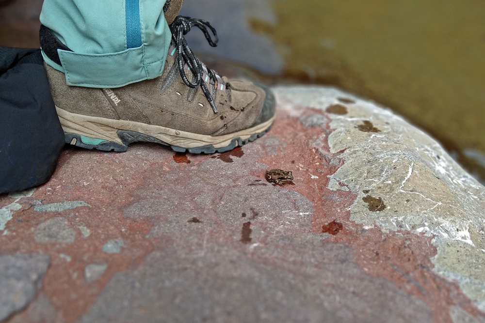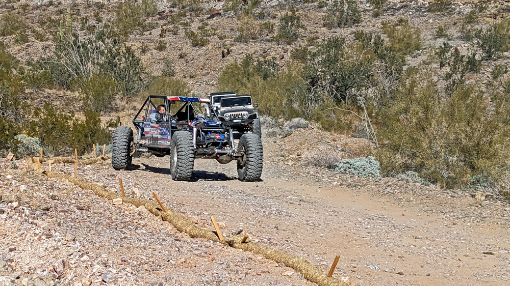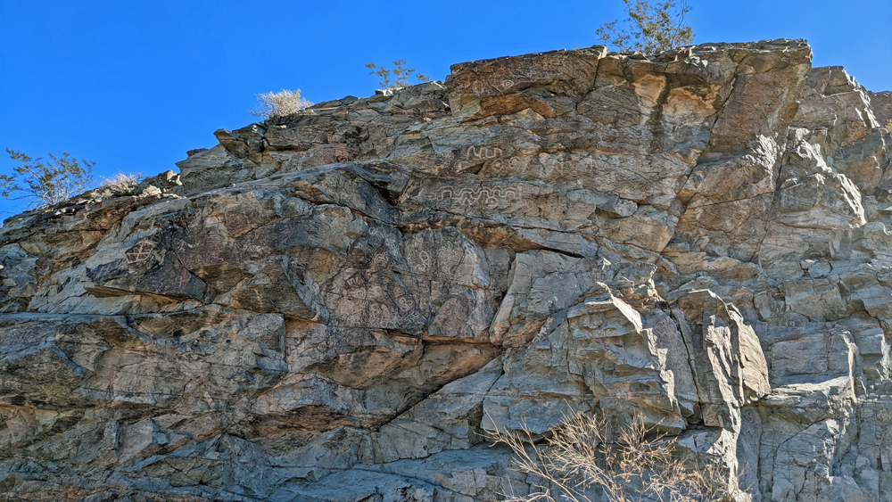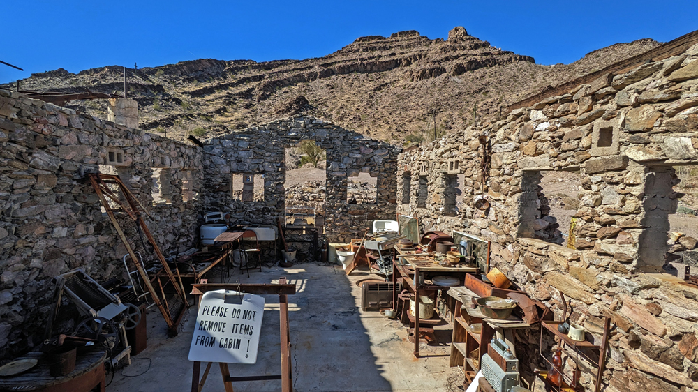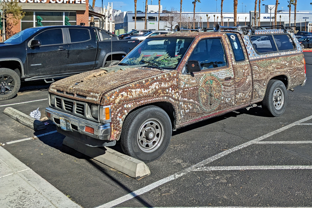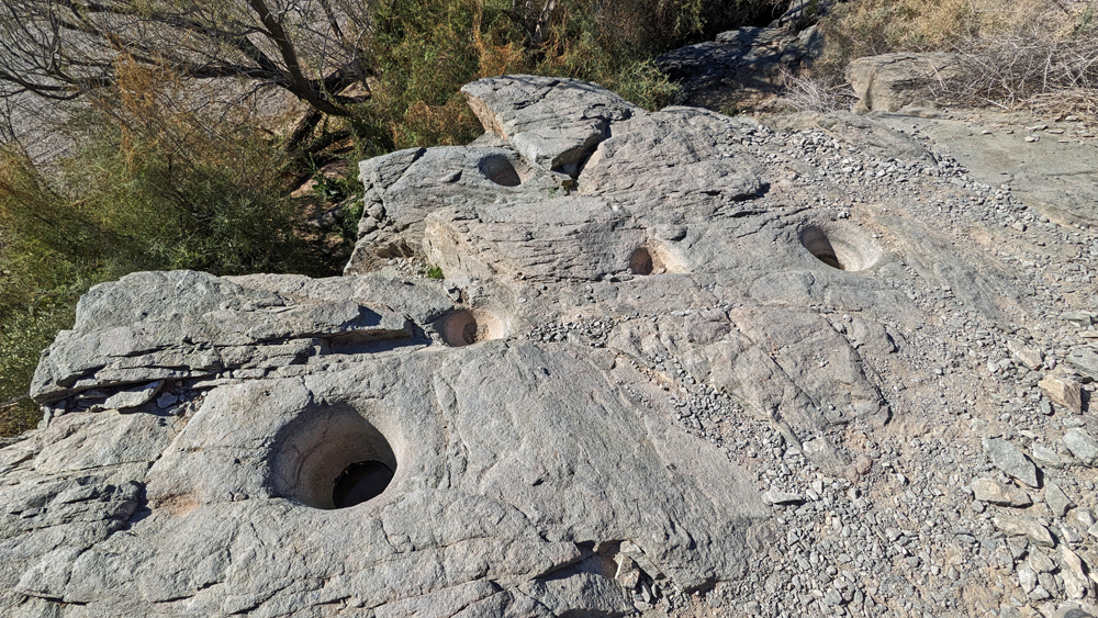 An einem Tag ist es aber doch mal so ruhig und schön, dass wir einen Ausflug in die Umgebung mitmachen können. Bill ist so lieb und leiht uns sein (neues) Side-by-Side und unsere Freunde, die sich hier natürlich super auskennen, zeigen uns (prä-)historische Petroglyphen und Mörser, den «Indian Footprint» (echter Fussabdruck oder Erosion?), wir lernen lokale Umweltkämpfer (mit sehr coolem Rock Crawler) kennen, besuchen die historische Gold Eye Mine (mit «potty lane»), machen Pause am «Deere Run Resort», einem witzigen «Nicht-Ort» mit noch witzigeren Schildern und gucken uns das «Rainbow Acres»-Quartier von Quartzsite an. Es ist ein toller Tag und unsere einzige Gelegenheit, einen kleinen Teil der Umgebung von Quartzsite näher kennenzulernen.