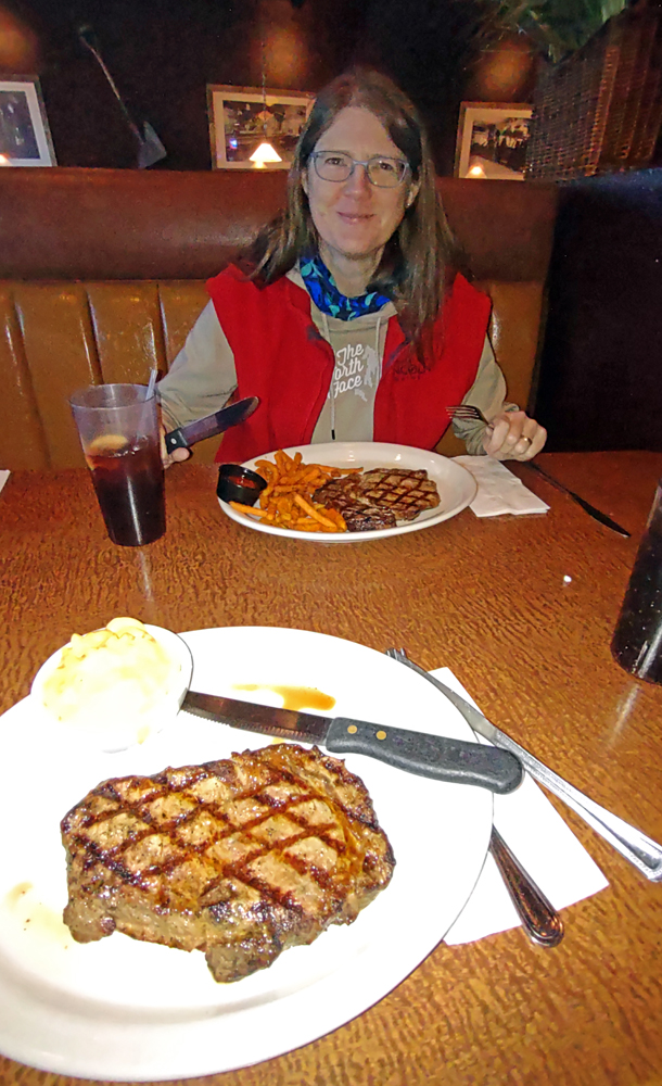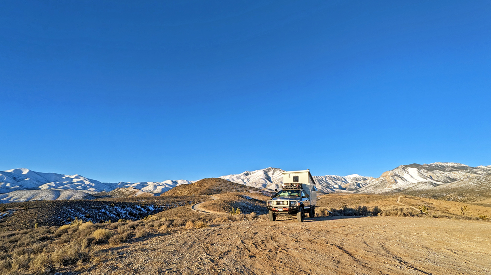 Sonst läuft aber alles glatt und nach einem «Begrüssungssteak» im Montana Meat Co. Verbringen wir die Nacht auf 1’500 m am Mount Charleston, direkt an der Schneegrenze…