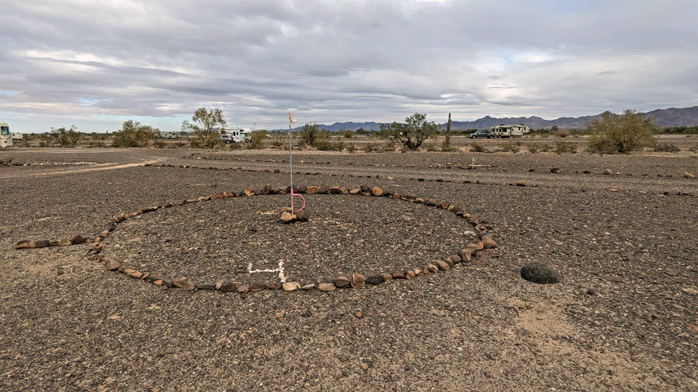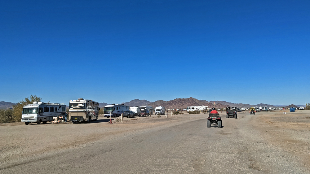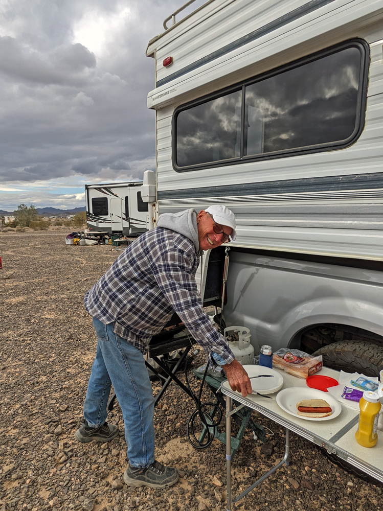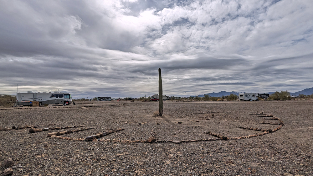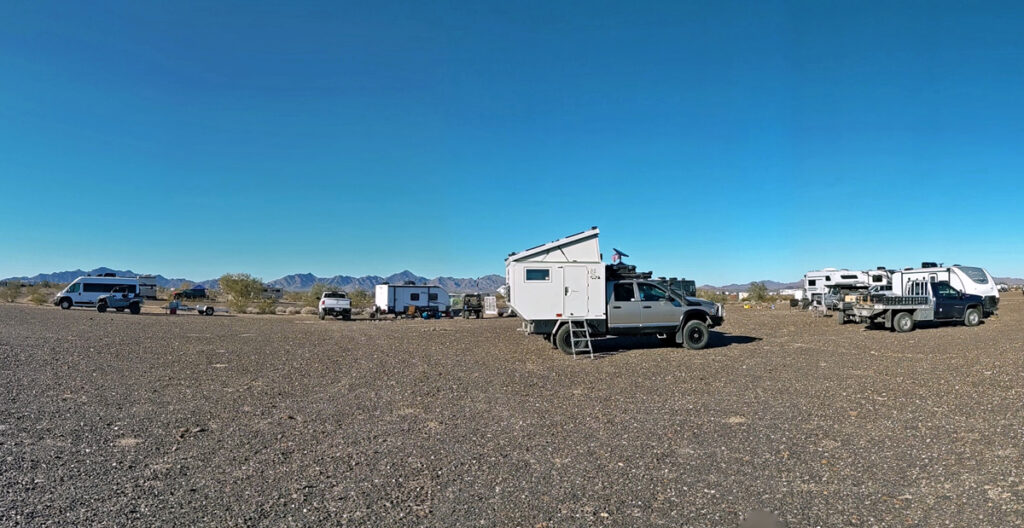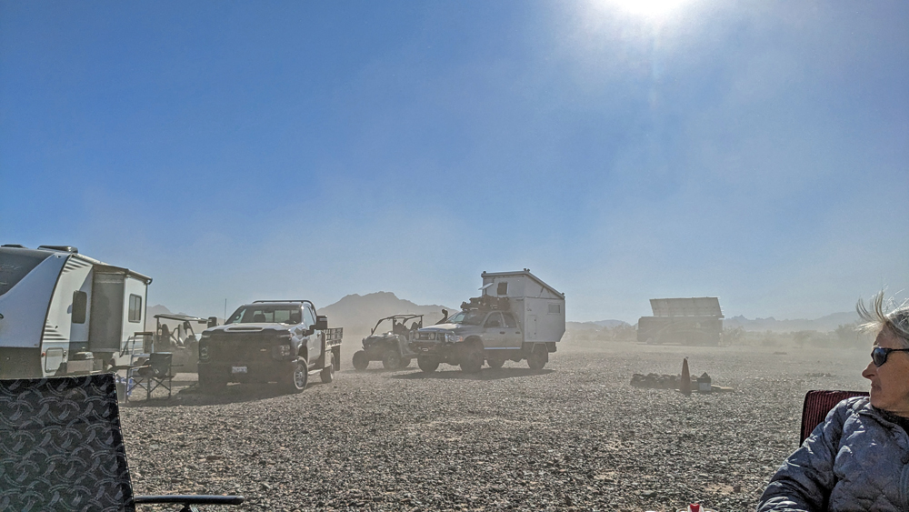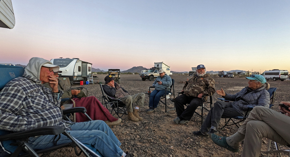 Dank Bills guter Beschreibung finden wir das Camp unserer Freunde bald. Sonst hätten wir keine Chance gehabt – nur in diesem Sektor muss es Tausende, wenn nicht Zehntausende von Fahrzeugen geben, von winzig bis zu riesig, die über das ganze Gebiet verstreut sind. Aktuell sind es sogar noch besonders viele, da gerade «The Tent» stattfindet, eine RV-Messe, wo man einfach alles bekommt (https://www.quartzsitervshow.com/ ). Zusätzlich hat es im Städtchen viele Geschäfte, die auf die im Winter erscheinende mobile Kundschaft spezialisiert sind, so dass dies wohl einer der besten Orte ist, sich auszustatten, wenn man etwas braucht (Monty und Deb ergreifen die Gelegenheit und können hier einen neuen Kühlschrank und Batterie kaufen und dann gleich professionell installieren lassen). Die Gespräche in der Runde drehen sich entsprechend auch oft um Solarzellen, Stromversorgung und Batterien (und ein bisschen StarLink, dessen «Schüsseln» man immer mehr sieht).