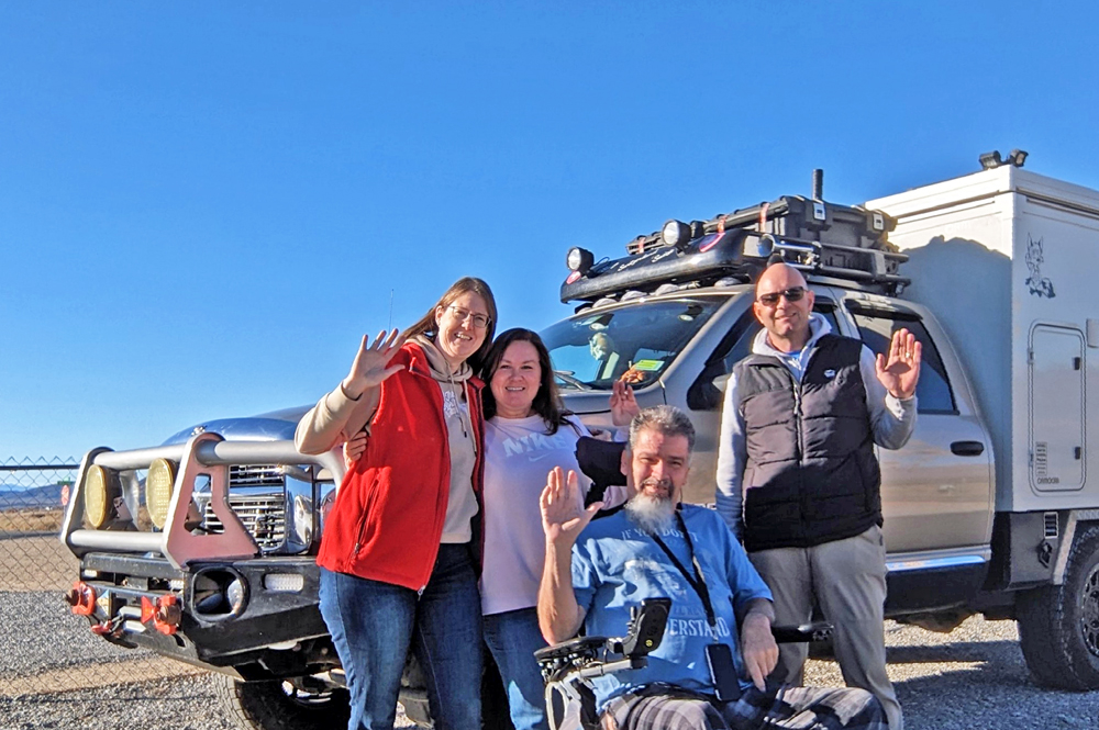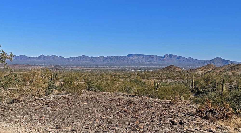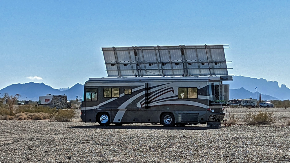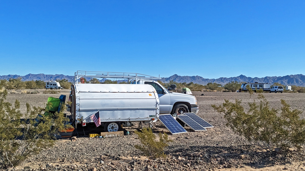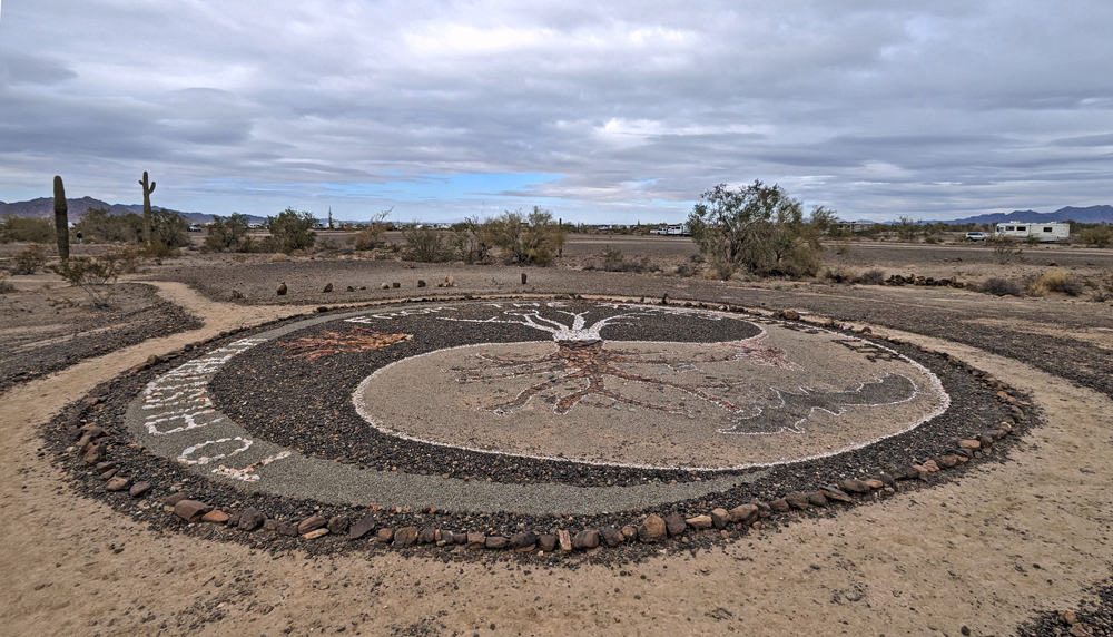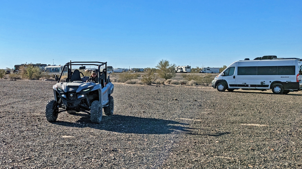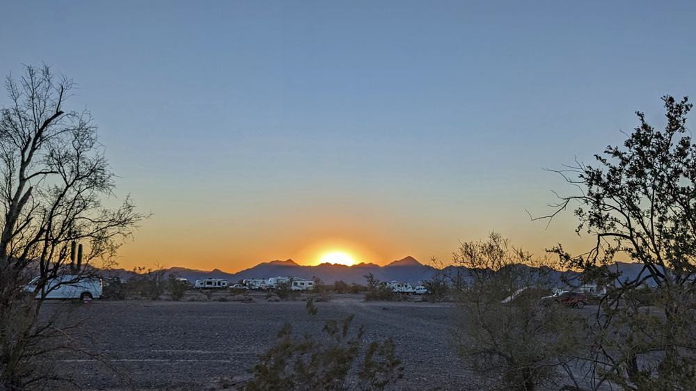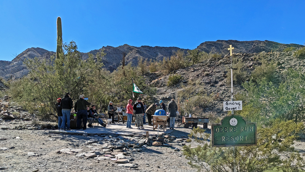 Dank Bills guter Beschreibung finden wir das Camp unserer Freunde bald. Sonst hätten wir keine Chance gehabt – nur in diesem Sektor muss es Tausende, wenn nicht Zehntausende von Fahrzeugen geben, von winzig bis zu riesig, die über das ganze Gebiet verstreut sind. Aktuell sind es sogar noch besonders viele, da gerade «The Tent» stattfindet, eine RV-Messe, wo man einfach alles bekommt (https://www.quartzsitervshow.com/ ). Zusätzlich hat es im Städtchen viele Geschäfte, die auf die im Winter erscheinende mobile Kundschaft spezialisiert sind, so dass dies wohl einer der besten Orte ist, sich auszustatten, wenn man etwas braucht (Monty und Deb ergreifen die Gelegenheit und können hier einen neuen Kühlschrank und Batterie kaufen und dann gleich professionell installieren lassen). Die Gespräche in der Runde drehen sich entsprechend auch oft um Solarzellen, Stromversorgung und Batterien (und ein bisschen StarLink, dessen «Schüsseln» man immer mehr sieht).