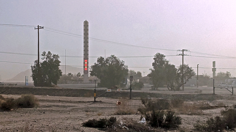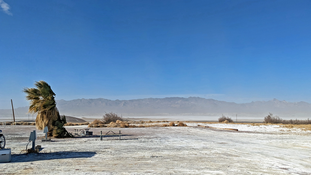 Es ist aber nicht nur hier auf dem Berg ungemütlich kalt, sondern auch in Las Vegas, so dass wir uns am nächsten Tag wieder auf den Weg machen. Das Saline Valley lassen wir aus, weil wir uns nicht einschneien lassen möchten, doch heisse Quellen müssen schon noch sein! Nachdem wir unseren Freund Mark und seine liebe Schwester Karen in Pahrump besucht haben, verbringen wir zwei Nächte auf dem Campground in Tecopa Hot Springs. Zum Glück ist das Wasser in den geschlechtergetrennten Badehäusern schön heiss, denn die Luft ist eisig kalt! Ausserdem frischt der Wind immer mehr auf und wächst sich zu einem veritablen Sturm aus. Der alkalische Sand, der die Umgebung bedeckt, wirbelt über die Ebene und wir beschliessen nach zwei Nächten, weiterzufahren. Am Morgen unserer Abfahrt stürmt es so stark, dass ich nicht mal mehr baden gehen kann, da das aus Brettern zusammengezimmerte Badehaus für die Damen aus Sicherheitsgründen gesperrt wird (der Betreiber meint, der Wind blase mit etwa 50 mph / 80 km/h).
