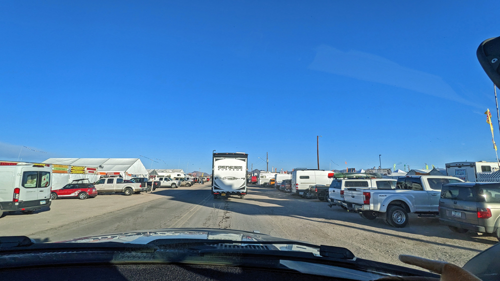 Die nächst Woche verbringen wir mit unseren «alten» Freunden und lernen neue Freunde – Mike mit Frau sowie Ron und Pam und Bills Bruder mit dessen Freundin – kennen. Leider ist das Wetter kühl und stürmisch. Wenn die Sonne draussen ist versuchen wir alle, uns im Windschatten eines der Fahrzeuge aufzuhalten, denn die Sonne gäbe so schön warm (und meinen ersten Sonnenbrand…). Teils ist der eisige Wind aber so stark, dass dichte Sand- und Staubschwaden den Aufenthalt im Freien nicht gerade angenehm machen. Immerhin kann ich an ein paar Tagen eine schöne Runde um den Magic Circle, eine grosses «clothing optional»-Areal machen. Der Weg ist an vielen Stellen so gut von Steinen befreit, dass man ihn nicht nur nackt, sondern auch barfuss gehen könnte (wegen der Kälte und des Windes sind die meisten, denen ich begegne allerdings zumindest teilweise bekleidet), und ist streckenweise mit schönen Kunstwerken verschönert.