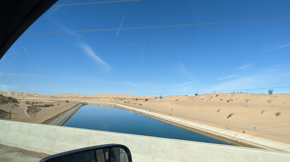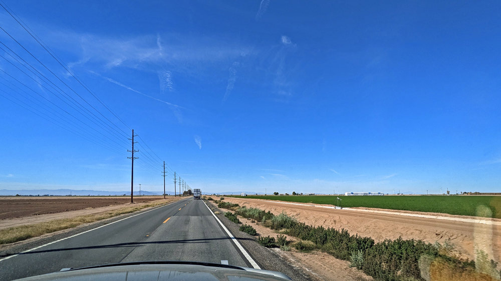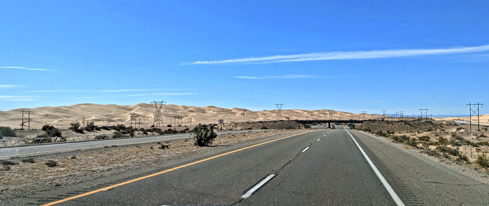 Am nächsten Morgen verabschieden wir uns von den beiden und fahren auf der I-8 parallel zu Grenze durch die Wüste, die beindruckenden Imperial Sand Dunes (ein rund 65 x 8 km langes System mit über 90 m hohen Dünen) und schliesslich durch endlos scheinende Felder.