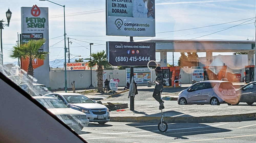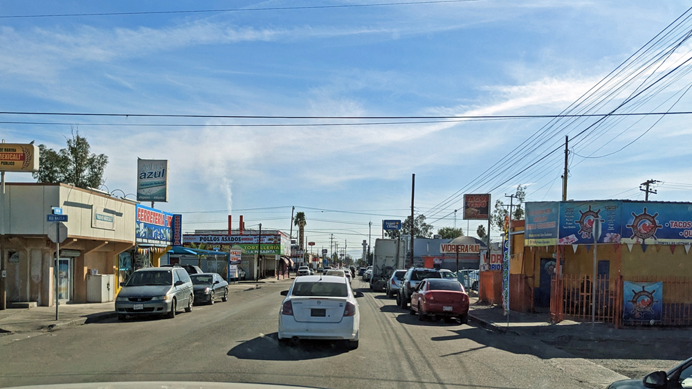 Allerdings gibt es dann doch zwei Probleme: erstens wird offenbar das US-Visum ins System eingetragen. Dass jemand zwei Pässe hat (gültiger Pass und abgelaufener Pass mit gültigem US-Visum) ist dabei aber offenbar nicht vorgesehen… Es gibt lange Diskussionen unter den Beamten und Beamtinnen verschiedenen Ranges und schliesslich muss ich ein langes, spanisches Dokument unterschreiben, wobei mir versichert wird, dass alles in Ordnung sei… Ich habe keine Ahnung, was ich da unterschrieben habe und hoffe einfach, dass dann bei der Ausreise bzw. Einreise in die USA alles klappt… Das zweite Problem ist, dass sich das Computersystem gerade verabschiedet (wegen meines Visum-Chaos???). Wir sind die letzten, die gerade noch «durchkommen»! Der Systemabsturz ist offenbar so gravierend, das der hinter uns inzwischen zu stattlicher Grösse angewachsenen Schlange von Wartenden empfohlen wird, doch stattdessen die Immigration im gut 10 km entfernten Mexicali West durchzuführen…