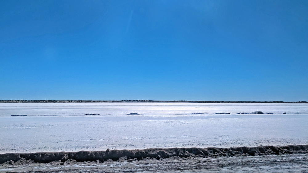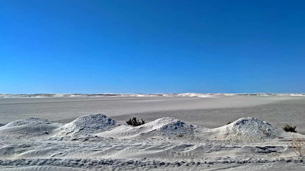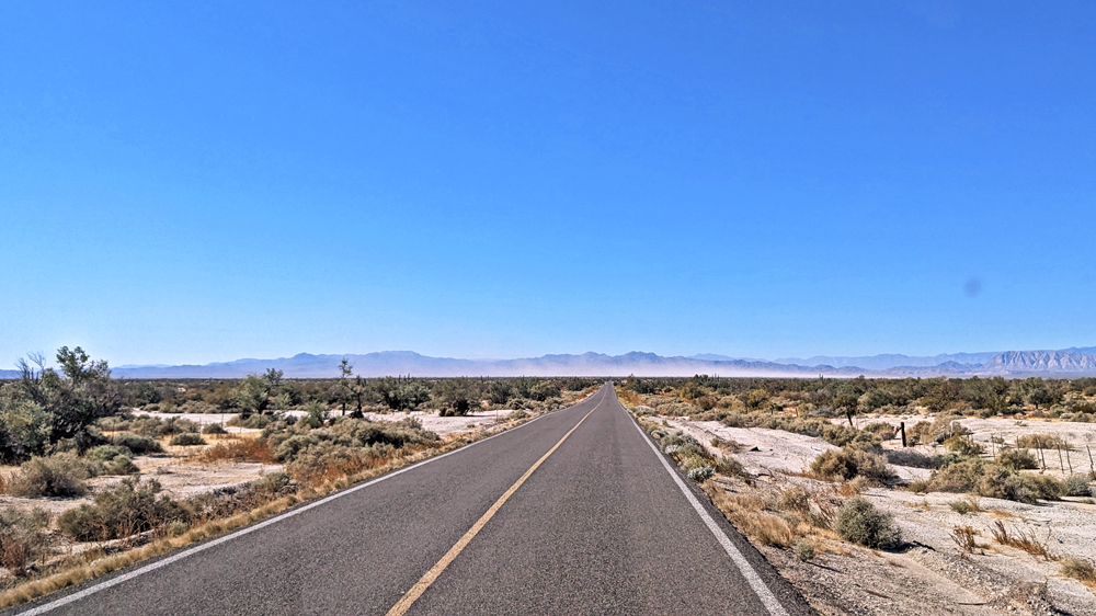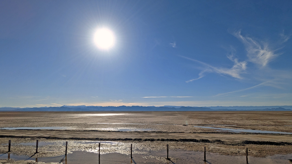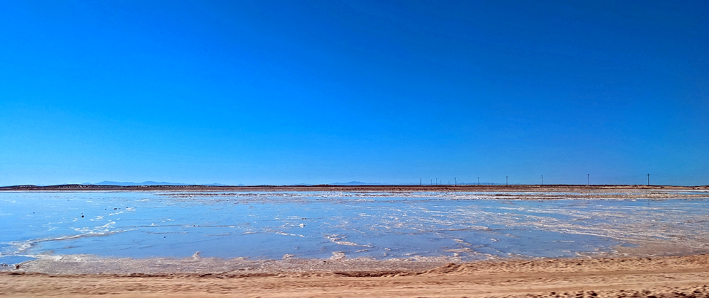 Wir aber sind nun auf dem Weg Richtung Süden! Mexicali verpasst uns gleich wieder den mexikanischen Verkehrsschock: 4-Way-Stops an fast jeder Kreuzung, Topes (= mehr oder weniger schlimme Temposchwellen), viele Spuren, Fussgänger, Hunde, Verkaufsstände, Autos in allen möglichen Nicht-Zuständen etc. Wir schaffen es aber unfall- und bussenfrei in den Walmart, um uns wieder mit Frischprodukten einzudecken, und dann auf die MEX-5 nach San Felipe. Hier wird es bald ruhiger, nicht nur verkehrstechnisch, sondern auch von der Landschaft her. Trotz der Eintönigkeit ist sie trotzdem irgendwie beeindruckend, führt die Strasse doch durch das flache Colorado River Delta bzw. den Salar, eine riesige Salztonebene, wo aktuell sogar teilweise noch etwas Wasser steht.