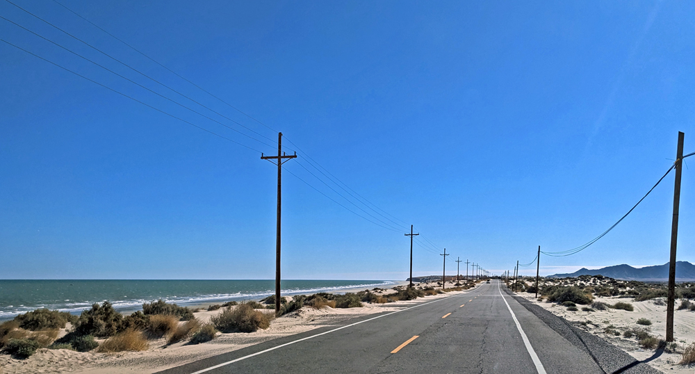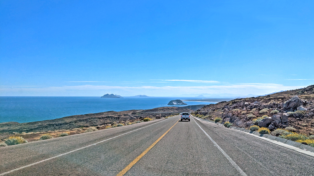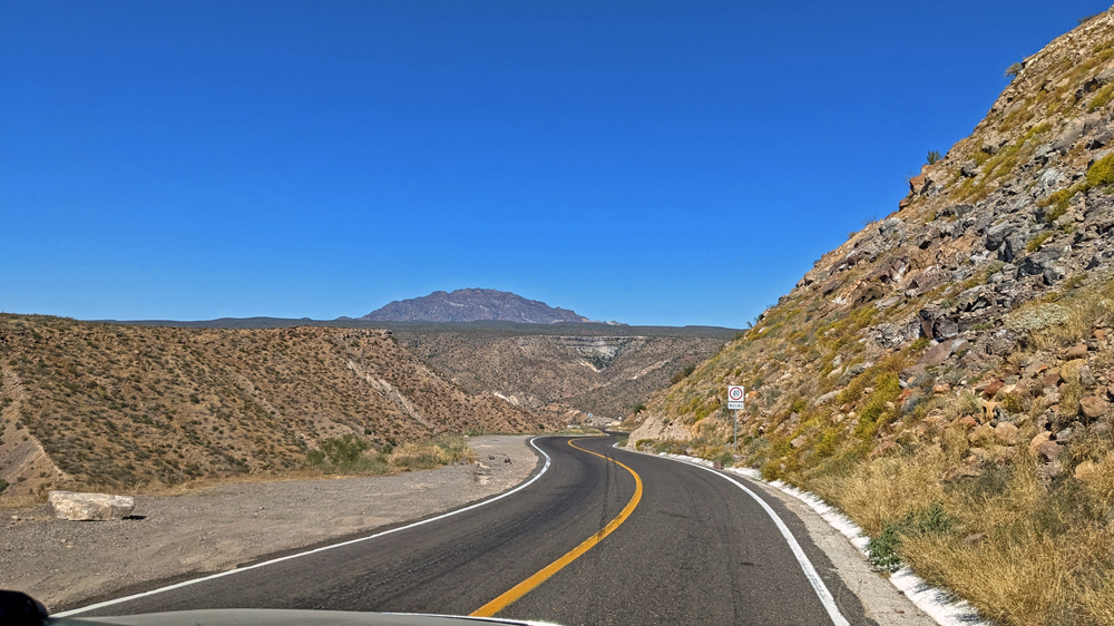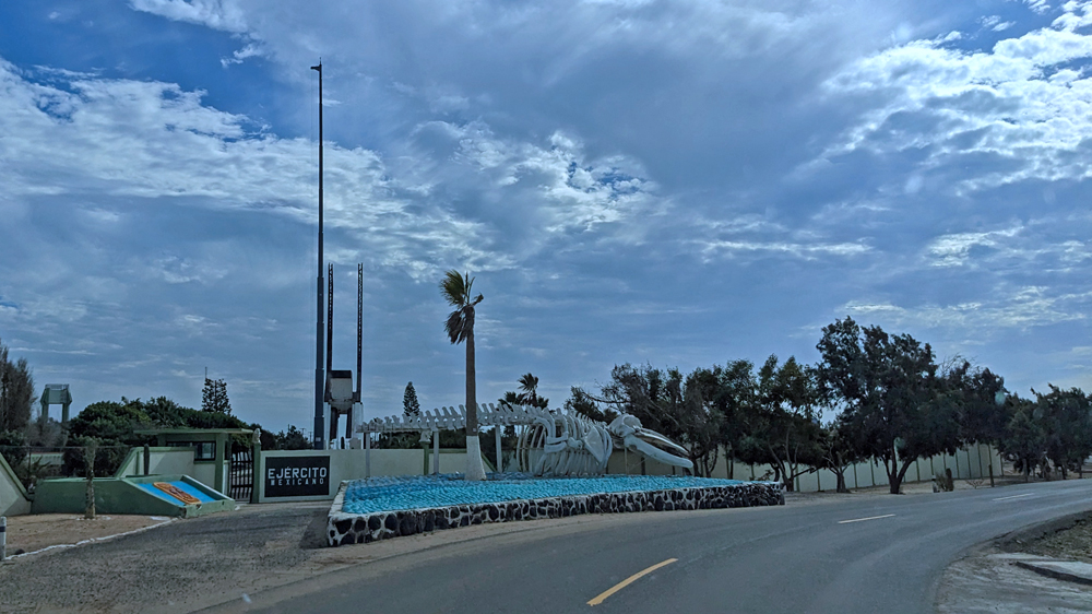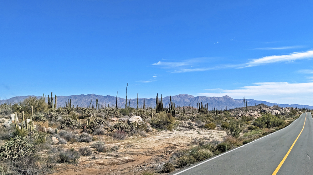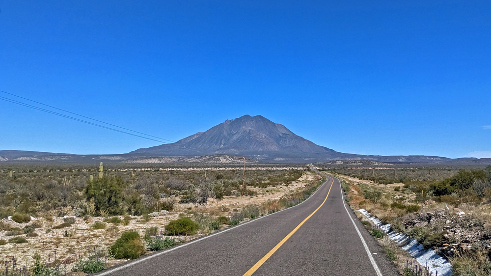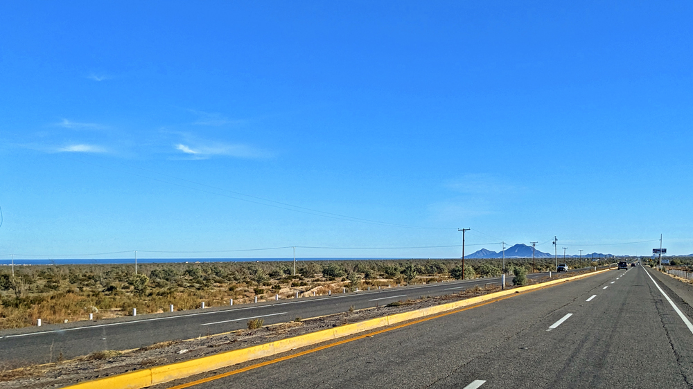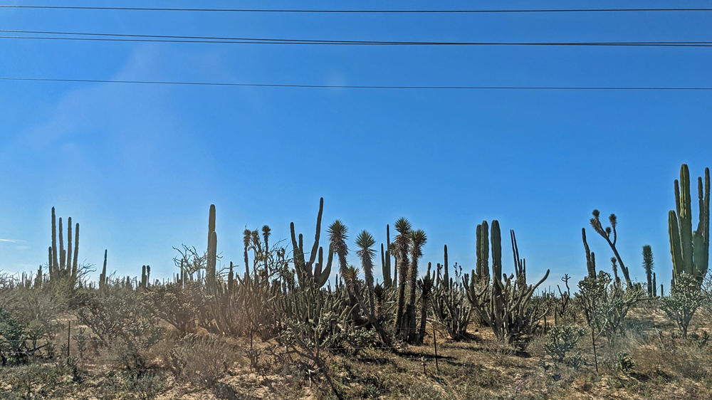 Die seit 2020 ausgebaute MEX 5 führt uns zunächst ein gutes Stück an der Küste entlang. Wir passieren einige Resorts in verschiedenen Stadien des Nicht-, Auf- und Abbaus. Dann biegt die ab Puertecitos neu gebaute Strasse in Richtung Inland ab und wir fahren durch schöne Kakteen- und Felslandschaften und vorbei an blühenden Agaven, bevor wir bei Chapala wieder auf die MEX 1 treffen, auf der wir 2019 in den Süden gefahren waren. Die Küstenebene westlich der Sierra ist noch gleich langweilig wie letztes Mal, dafür wird man – als Gringo – dieses Mal am Landwirtschafts-Checkpoint an der Grenze zur Baja California Sur nur aufgehalten, um 20 MEX bzw. 1 USD zu bezahlen, ohne, dass das Auto kontrolliert oder desinfiziert würde… (der «Beamte» erscheint uns auch eher wie jemand, der sich so ein Auskommen geschaffen hat…).