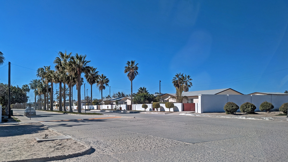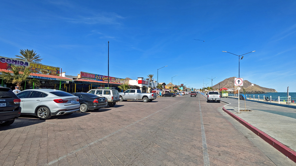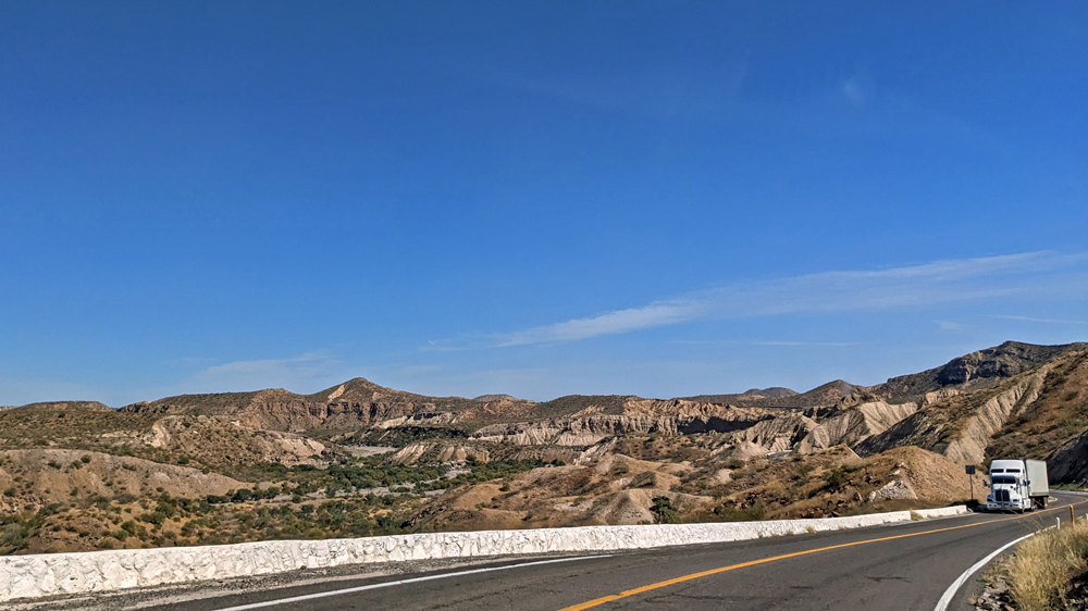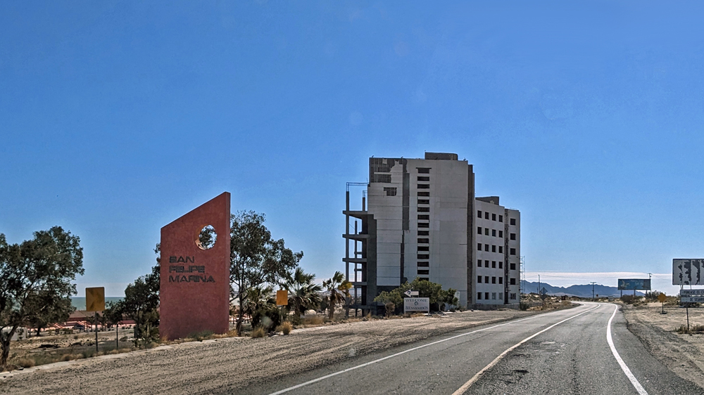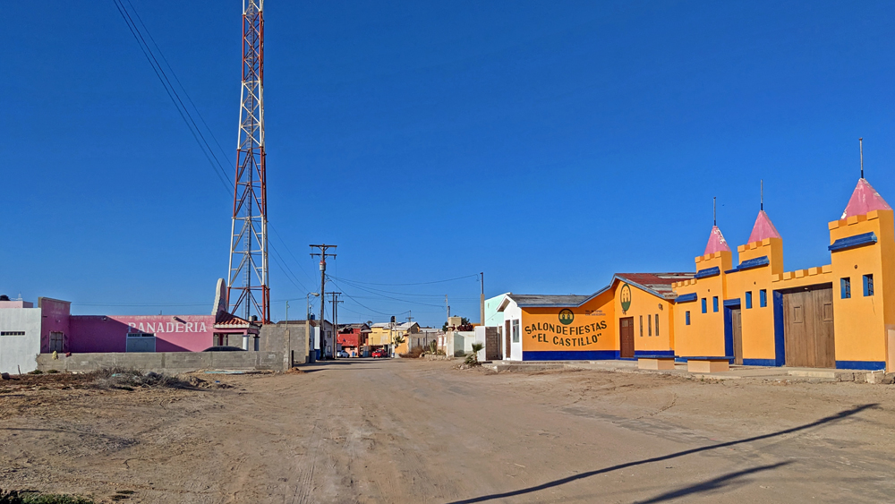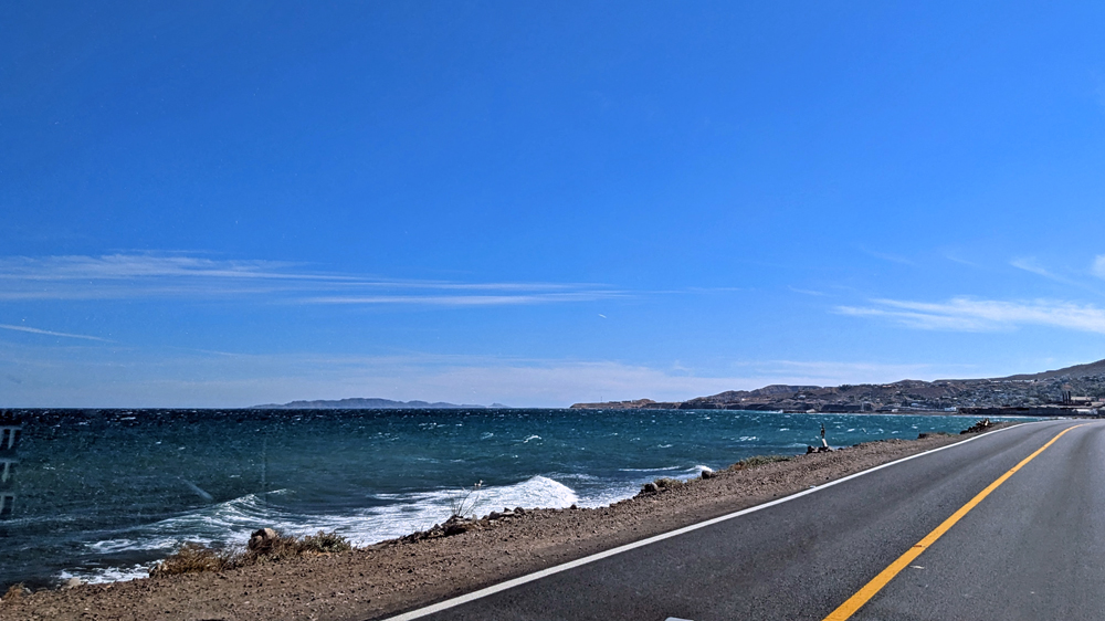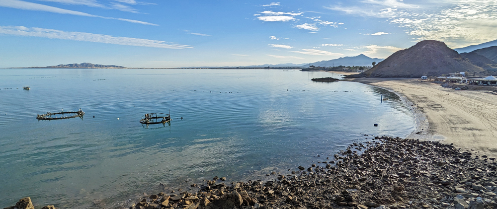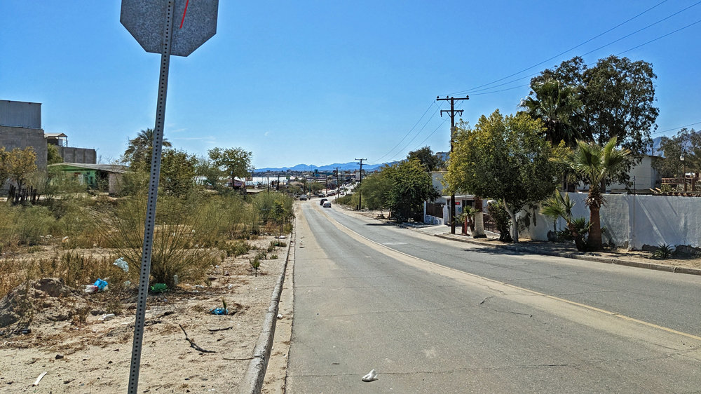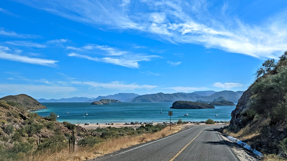 Die seit 2020 ausgebaute MEX 5 führt uns zunächst ein gutes Stück an der Küste entlang. Wir passieren einige Resorts in verschiedenen Stadien des Nicht-, Auf- und Abbaus. Dann biegt die ab Puertecitos neu gebaute Strasse in Richtung Inland ab und wir fahren durch schöne Kakteen- und Felslandschaften und vorbei an blühenden Agaven, bevor wir bei Chapala wieder auf die MEX 1 treffen, auf der wir 2019 in den Süden gefahren waren. Die Küstenebene westlich der Sierra ist noch gleich langweilig wie letztes Mal, dafür wird man – als Gringo – dieses Mal am Landwirtschafts-Checkpoint an der Grenze zur Baja California Sur nur aufgehalten, um 20 MEX bzw. 1 USD zu bezahlen, ohne, dass das Auto kontrolliert oder desinfiziert würde… (der «Beamte» erscheint uns auch eher wie jemand, der sich so ein Auskommen geschaffen hat…).