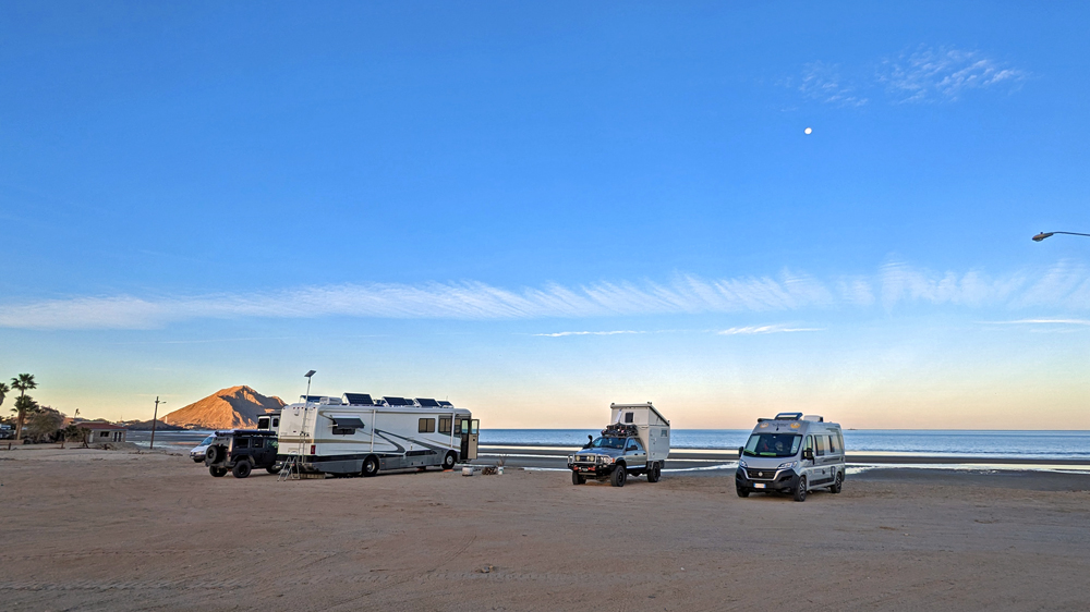 Nach diesem schönen Erlebnis bleiben wir noch zwei Tage in Loreto und fahren dann nach La Paz, wo wir uns wieder mit unseren Reisefreunden Sibylle und Hermann treffen wollen (das letzte Mal hatten wir im Herbst in Dawson City einige Tage miteinander verbracht). Sie sind schon länger hier und kennen all die schönen Orte auf der Baja. Wir werden die nächsten rund zwei Wochen zusammen reisen und dank Ihnen sozusagen ein «best of southern Baja» erleben dürfen (wir waren im 2019/20 ja nur bis Agua Verde gekommen). Als wir auf dem Campestre Maranatha, wo uns die beiden netterweise einen Platz reserviert haben, ankommen (auch hier ist es wegen des am Wochenende stattfindenden Carnevals gut voll), erleben wir gleich noch eine freudige Überraschung: da steht nicht nur das «D-Hai» von Annens, sondern auch noch der Duro von den «Dubus» Claudia und Thomas! Was für ein schönes Wiedersehen! – die beiden hatten wir im April 2021 das letzte Mal getroffen.