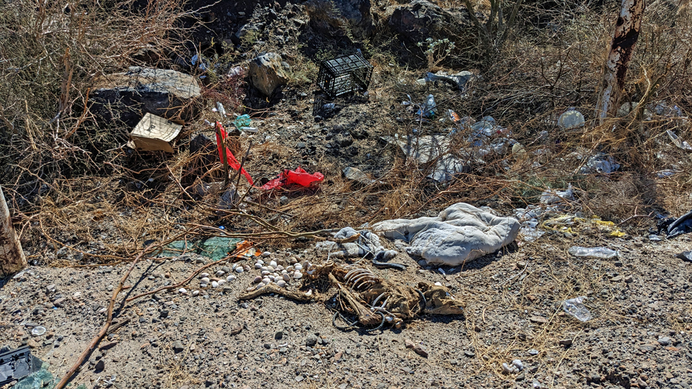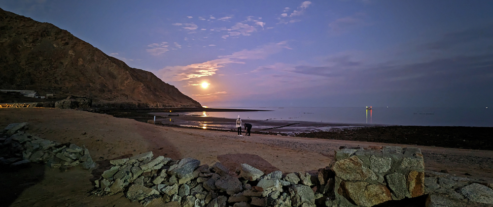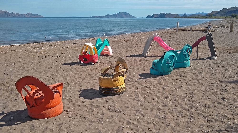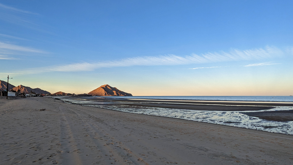 Die erste Nacht kommen wir im Club de Pesca RV Park in San Felipe unter, eigentlich eher eine Ansiedlung aus kleinen, aus Backstein gebauten Ferienhäusern, mit einigen, wenigen, sardinenengen Campspots, die alle besetzt sind. Immerhin gibt es – zehn Minuten Fussweg entfernt von Duschen und WC – noch einen Platz am Strand, wo wir für sagenhafte 400 MEX (rund 20 CHF) stehenbleiben dürfen (bezahlen können wir erst am Morgen danach, weil offenbar das Office vor vier Uhr nachmittags nicht nehr besetzt ist…). Überall sind die Spuren des Hurrikans Kay von letztem September sichtbar, der hier grosse Teile des Strandes weggerissen und für hohe Absätze gesorgt hat.