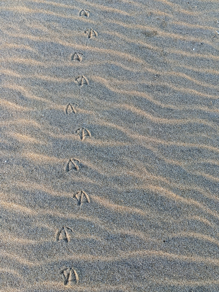 Den Rest der dann etwa fünfstündigen Walbeobachtung läuft immer etwa ähnlich ab: alle gucken auf dem dümpelnden Boot angestrengt in alle Richtungen (die Abtauchrichtung des Wals hat nichts zu bedeuten), bis jemand einen Blas entdeckt, dann rast der Kapitän dorthin und je nachdem, wie weit der Blas weg war, bekommt man noch einen bis mehrere der meist etwa vier Auftaucher zum Luftholen aus der Nähe zu sehen. Die Wale sind zu gross, um weit aus dem Wasser zu kommen, dennoch ist es beeindruckend, wie lange es dauert, bis sich das dunkel blau-graue Tier vom Blasloch bis zur im Vergleich winzigen Rückenflosse durch das Wasser «geschoben» hat (eine Fluke sehen wir leider nicht mehr); wir haben manchmal fast einen Eindruck wie bei einem sich langsam (und lautlos) bewegenden Güterwagen. Beim beim letzten Malwird der Rücken zum Abtauchen stärker gekrümmt und zurück bleibt dann der «Fussabdruck», eine im welligen Meer glatt erscheinende ovale Fläche, die vom Sog durch seine Grosse Masse verursacht wird.