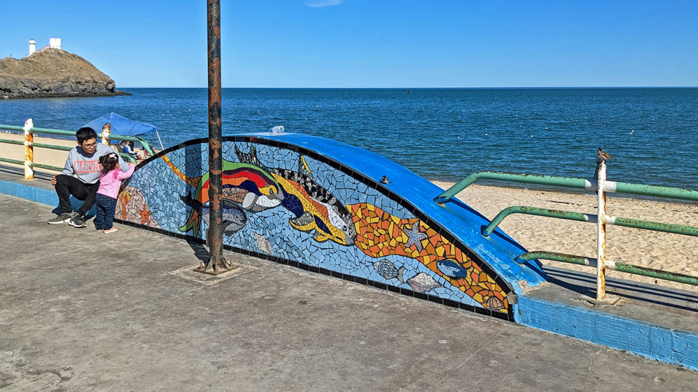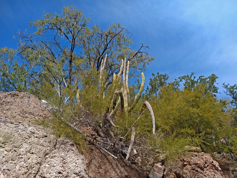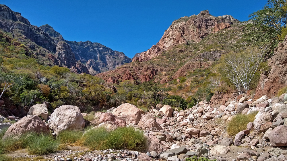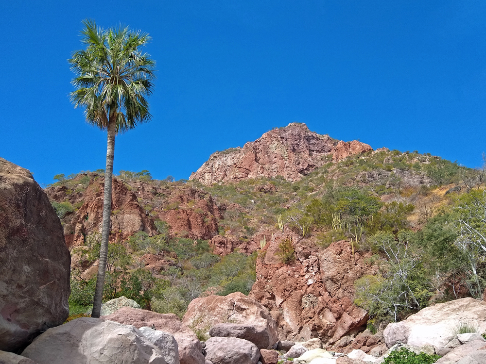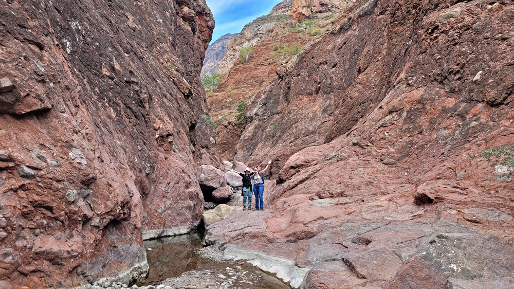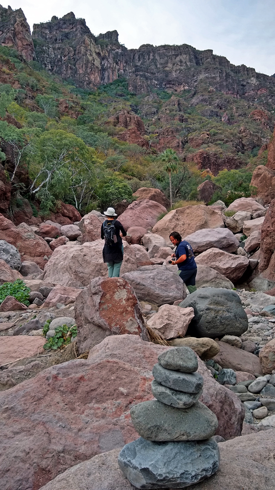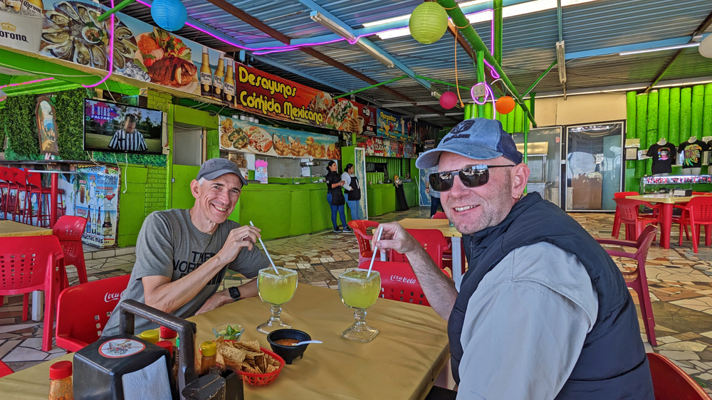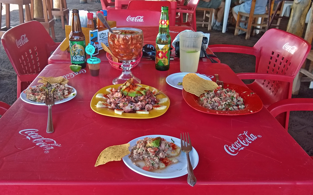 Bald lernen wir auch Valentin und Nadia kennen. Sie sind aus der Schweiz und ein Jahr mit einem in Kanada gekauften Pickup-Camper unterwegs. Wir machen gemeinsam einen Ausflug in den wunderschönen Cañón Tabor, der dank Valentins Kakteen-Begeisterung und -Kenntnissen noch spannender wird. Die vielen durchs Wandern verbrannten Kalorien müssen natürlich aufgefüllt werden und wir geniessen auf derr Rückfahrt im «Clam Shack» eine Auswahl an Gerichten mit Fisch und Meeresfrüchten (leider keine lokalen Chocolate-Muscheln). Bevor die beiden abfahren verbringen wir einen denkwürdigen Abschiedsabend im nahegelegenen Casa Carmen-Restaurant, wo wir nicht nur von zwei (teils sehr verstimmten…) Musikern besungen werden, sondern Valentin das Fischfilet «Diabla» bestellt – und ganz heroisch, buchstäblich unter Tränen inklusive Sauce aufisst!