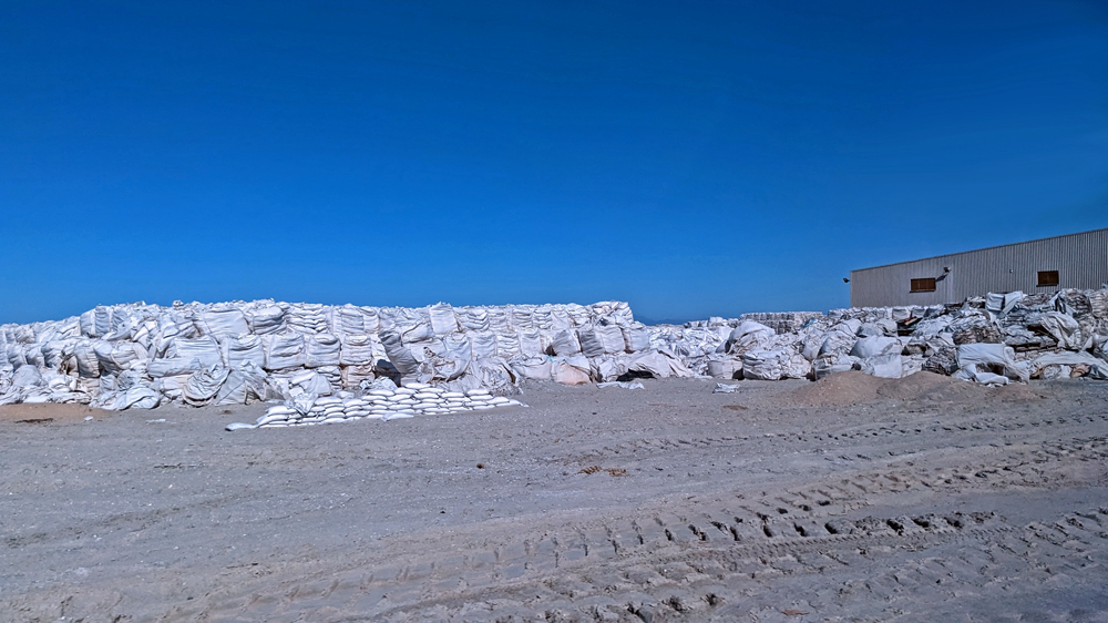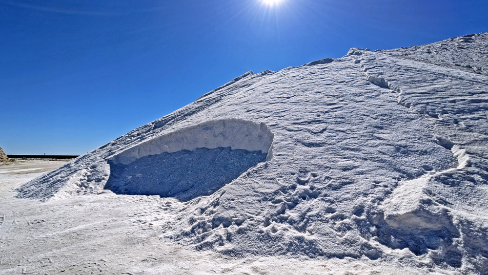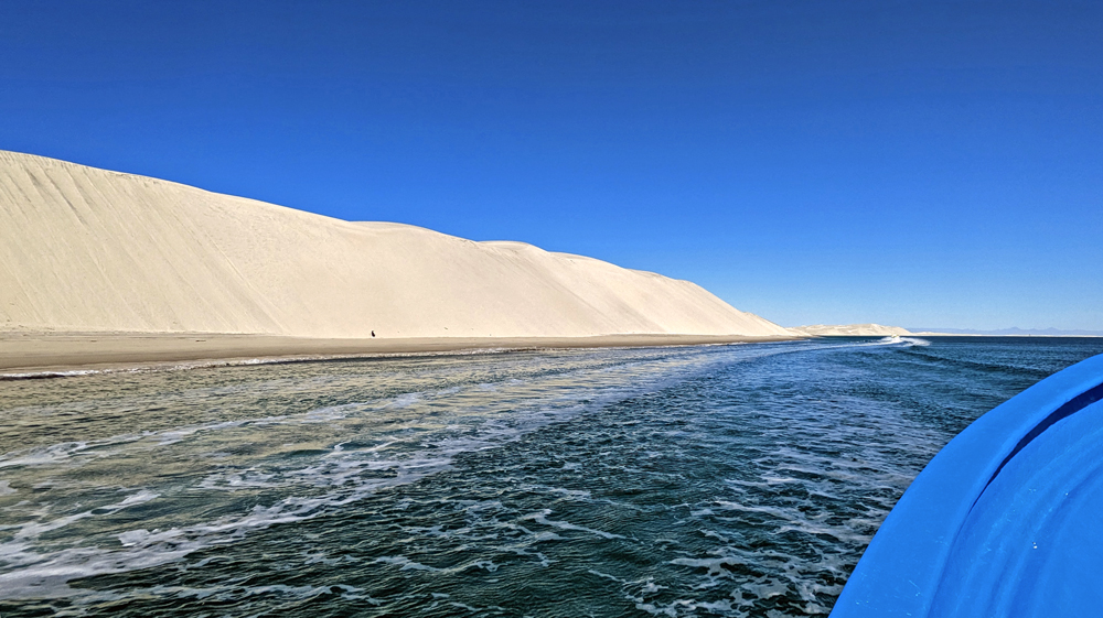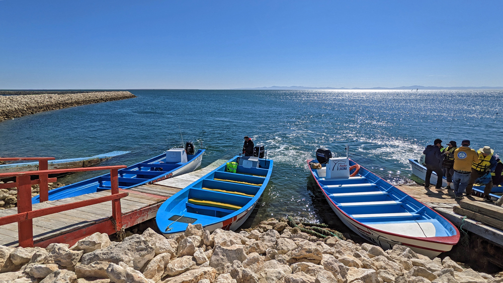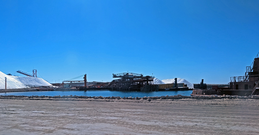 Am nächsten Morgen geht es los zu den Walen! Die Anlegestelle für das Boot befindet sich auf dem Gelände der «Salzfabrik». Der Unterschied zwischen den Gebäuden und Strassen in der «normalen» Stadt und dem Firmengelände ist eklatant. Dann verlassen wir die Stadt und passieren die in allen möglichen Farben schimmernden Salinen und den grossen Salzberg, bevor es aufs Wasser geht (wir erfahren, dass dieses Salz aus der weltgrössten Saline aus wirtschaftspolitischen Gründen nur als Strassen- und Industriesalz und nur lokal als Speisesalz verwendet werden darf, damit die kleineren Salzwerke im Land keine Konkurrenz haben…).