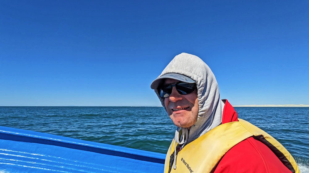 Wir sind froh, haben wir uns warm angezogen, denn auf der Lagune ist es kalt und windig. Unser Kapitän spricht leider praktisch kein Wort (weder englisch noch spanisch). Zum Glück haben wir von anderen Reisenden auf dem Campingplatz schon ganz viele Informationen zur Tour und dem Verhalten der Wale bekommen. Wir sind jedoch trotzdem froh, dass wir ihn haben, denn er ist ein super Bootsführer, der dafür sorgt, dass das Boot nicht so schlägt (und auf dem Heimweg ganz geschickt, die Welle unseres «Vor-Fahrers» reitet, der anständig durchgerüttelt wird), so dass die Fahrt hinaus auf die wellige Lagune ganz angenehm ist.