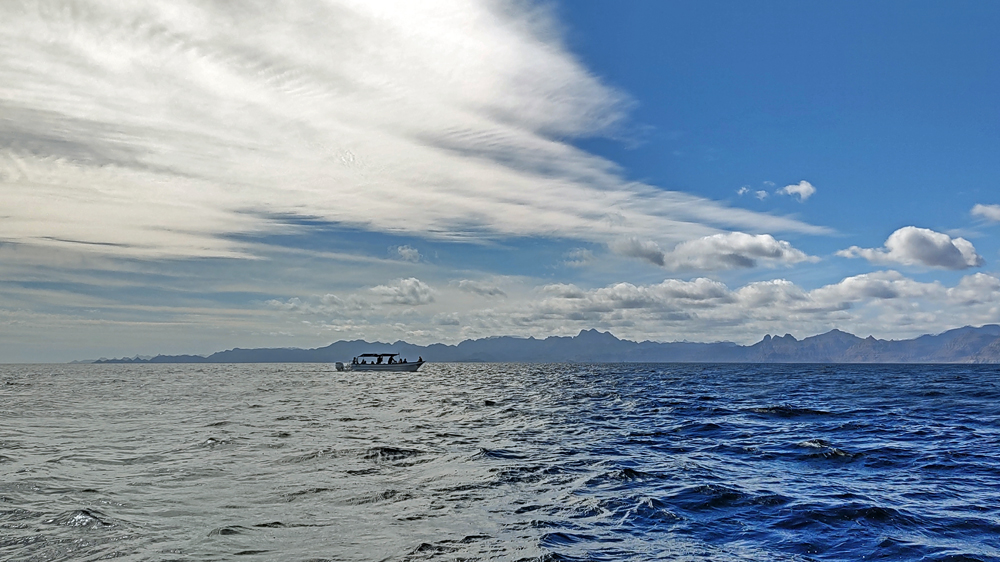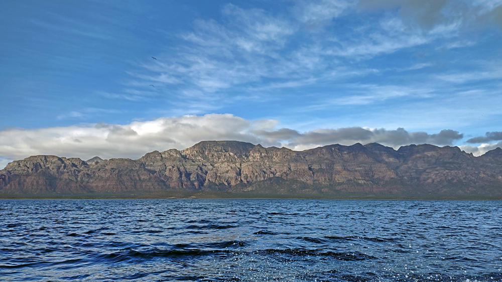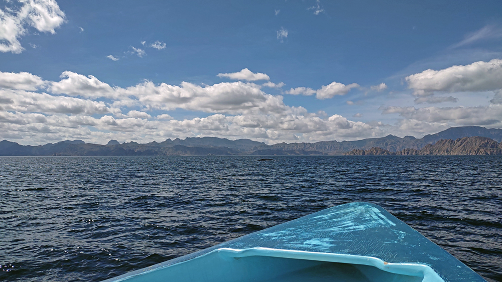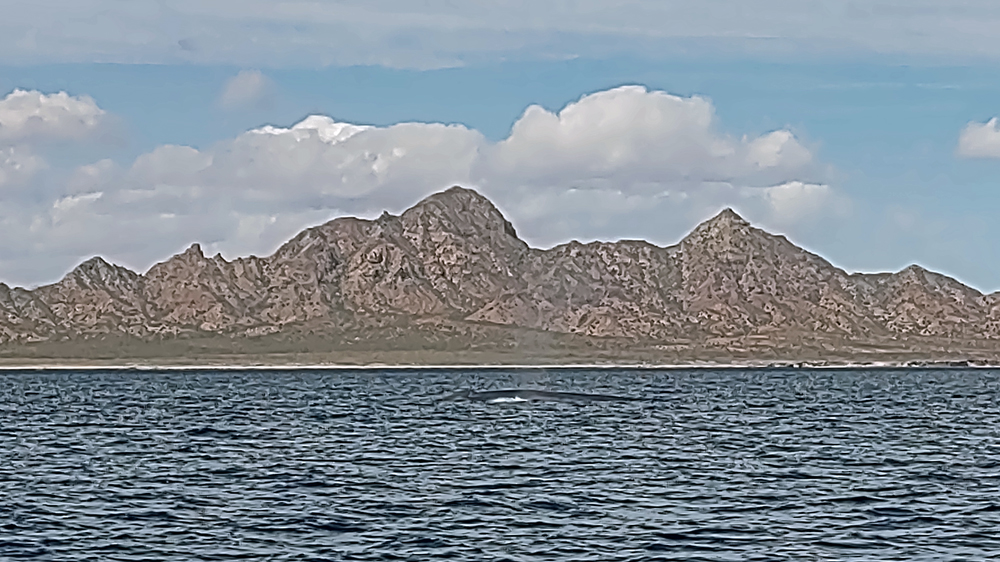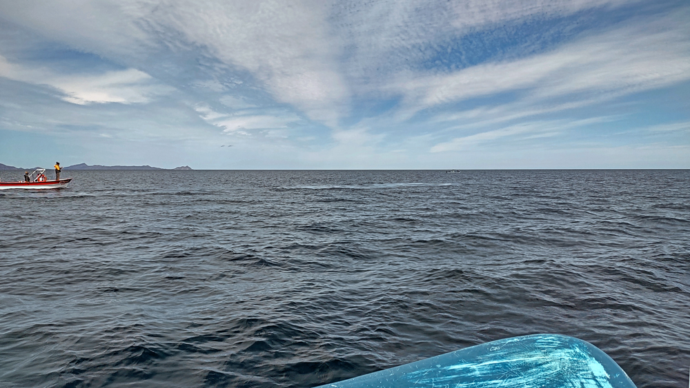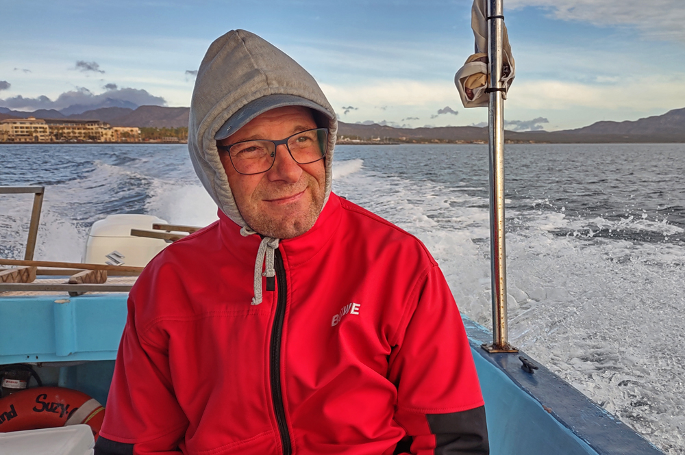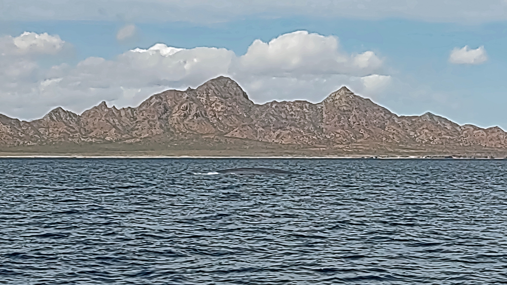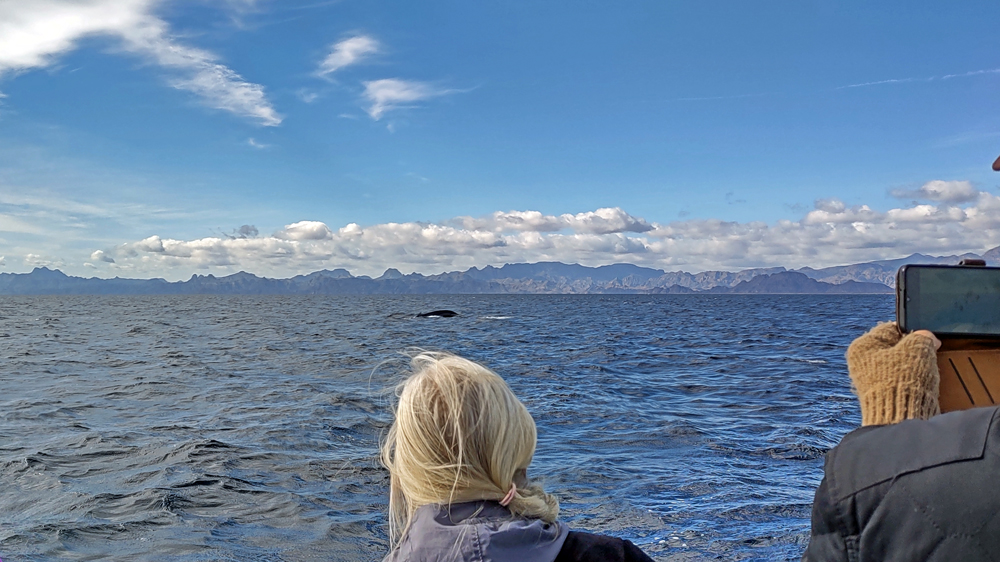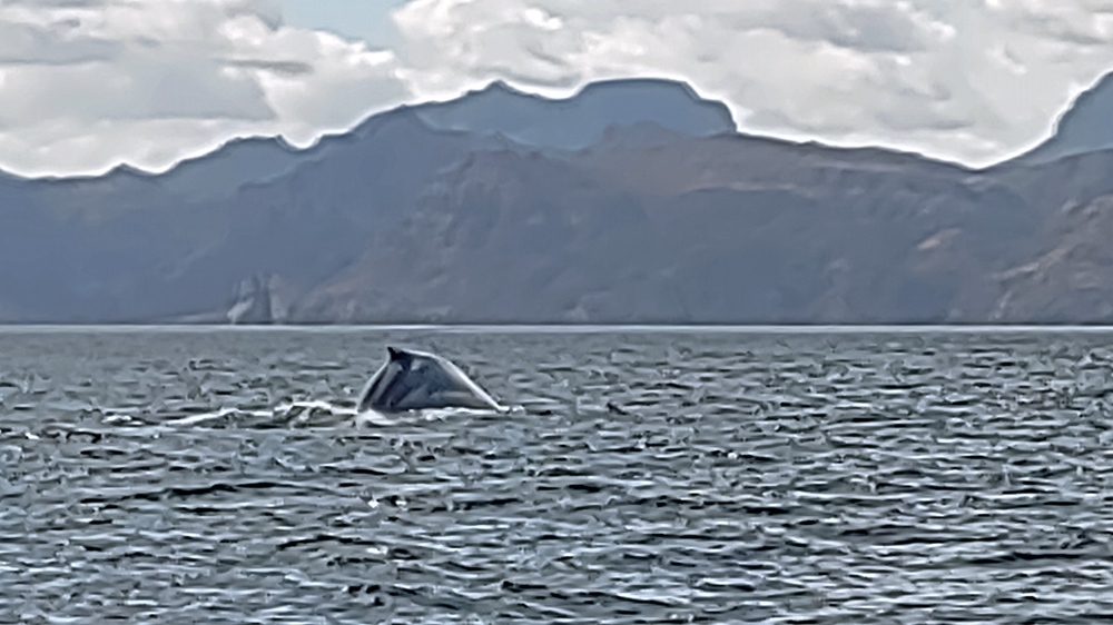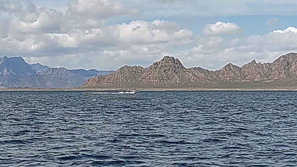 Der Anfang der Tour ist nicht besonders erfreulich: zunächst wissen wir nicht, wo unsere Gruppe bzw. unser Boot ist. Wir laufen am Hafen fünf Mal vom Leuchtturm (angeblicher Treffpunkt) zur Wal-Statue und wieder zurück. Jemand hat dann Mitleid und ruft unseren Touranbieter an, welcher tatsächlich einen Repräsentanten schickt, der uns dann an einen Herrn weiterreicht, der uns wiederum einer Dame übergibt, die nochmals mit uns hin und herläuft. Schliesslich werden wir dann doch noch zu einem Boot geführt, wo uns ein Ire namens David, seines Zeichens wohl Meeresbiologe oder so, begrüsst. Uff! Wenig später legt das Boot ab und wir fahren gut 40 km zur Danzante Bay, wo wir ein Paar vom dortigen Resort abholen. Die Bucht ist flach und der Wind bläst das Boot gegen den Strand, so dass wir erst mal festsitzen. Dank Mithilfe der beiden, die dann kaum wieder ins Boot kommen, schaffen wir es dann aber doch noch ins tiefere Wasser. Jetzt kann die eigentliche Tour beginnen! Wir sind froh, dass wir uns warm angezogen haben, denn bereits auf dem Weg hierher war es empfindlich kalt. Als wir aus dem Windschatten der Küste kommen, wird der Wind noch stärker und eisiger. Einige Teilnehmer sind nur mit T-Shirt, Shorts und Flipflops bekleidet und wickeln sich verzweifelt in alle verfügbaren Badetücher und Leih-Textilien. Die Tourboote stehen mit Funk untereinander in Verbindung und deshalb bringt uns unser Kapitän zielstrebig auf die Ostseite der Isla Carmen. Bald sehen wir einen Buckelwal, der jedoch schnell ab- und irgendwie auch nie wieder auftaucht…