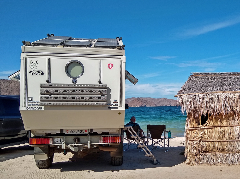 Da Sibylle und Hermann endgültig Richtung Norden wollen/müssen, fahren wir als nächstes zum Strand von Los Frailes. Hier ist viel mehr los. Die Vanlifer und Overlander sammeln sich im Arroyo und – je nach Fahrwerksausstattung – am Strand. Wir machen Strandspaziergänge und können Mobula-Rochen beobachten, die aus dem Wasser springen. So cool! Die Wale sind hier allerdings weiter weg.
