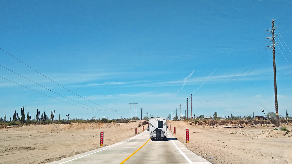 Kurz vor La Ribera treffen wir Annens nochmals zum gemeinsamen Reifen-Aufpumpen, denn ab hier ist die Strasse wieder geteert. Die Fahrt geht bald noch etwas flotter voran, denn wenig später treffen wir beim Ort mit dem klingenden Namen Colonia María Sandéz Viuda de González wieder auf die MEX-1, die uns zuerst nach Los Barriles an der Küste und von da in zahlreichen Kurven durch die nördlichen Ausläufer der Sierra de la Laguna nach La Paz führt. Wir müssen uns erst wieder ans dortige Verkehrschaos gewöhnen, das durch grosse Baustellen nicht gerade besser wird, und uns einen (wie wir feststellen sehr ungünstigen Weg) zu unserem Übernachtungsplatz suchen.