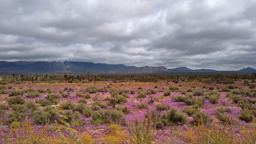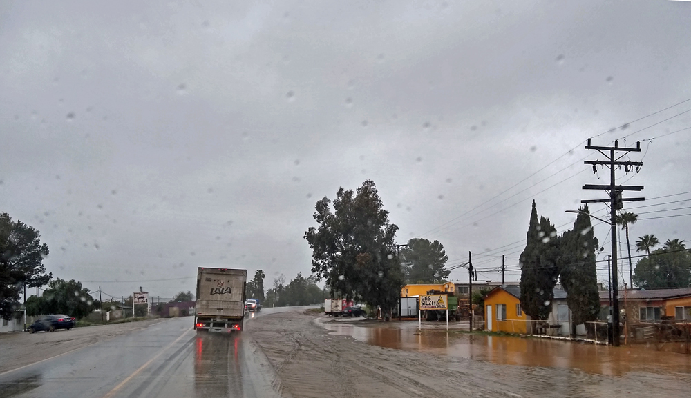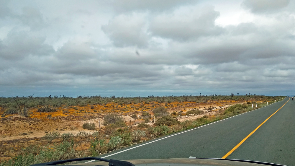 Bei Chapala fahren wir dieses Mal nicht auf die MEX-5 Richtung San Felípe, sondern bleiben auf der «alten», berühmt-berüchtigten MEX-1, weil wir ja noch unsere Freunde Ricardo und Eliz in La Bufadora bei Ensenada besuchen wollen. Die Strasse ist immer noch gleich schlimm wie wir sie in Erinnerung hatten und das schlechte Wetter hilft auch nicht. Immerhin blüht es dieses Mal und alles ist so grün, wie wir es noch nie gesehen hatten.