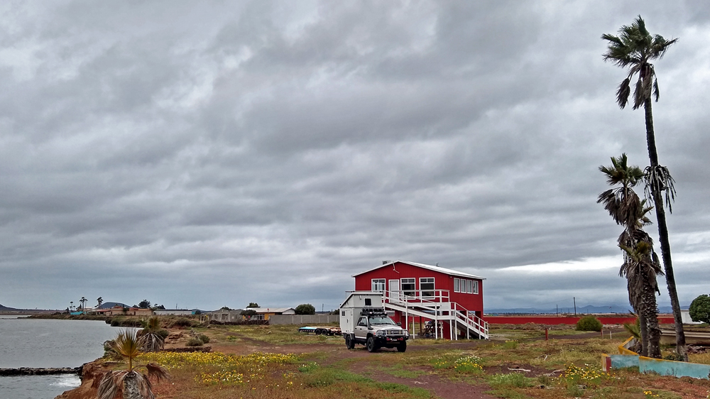Wir übernachten wieder bei Don Eddie’s Landing bei San Quintín. Dieses Mal ist es aber eher deprimierend – wir sind die einzigen (hier im nördlichen Teil der Baja ist die Saison im Sommer), das Wetter ist grau, windig, regnerisch und sehr kalt und dazu sie sind mitten im Umbauen. Zudem ist das Restaurant, auf das wir uns gefreut hatten, heute zu! Oh well.