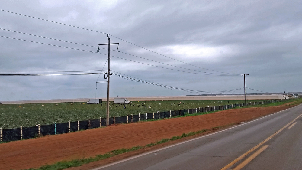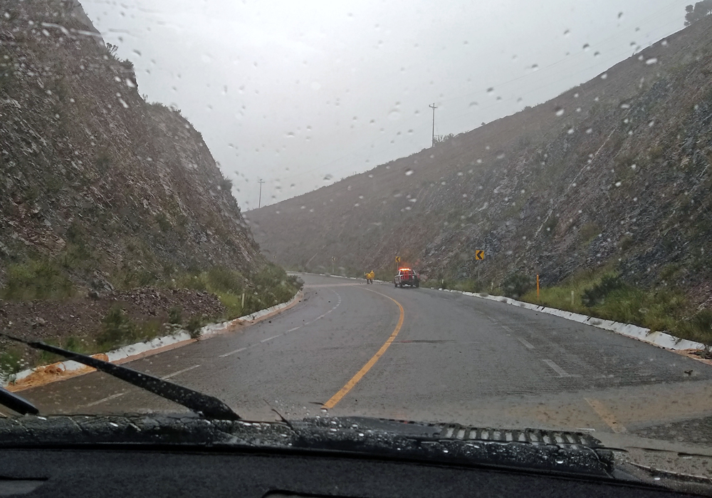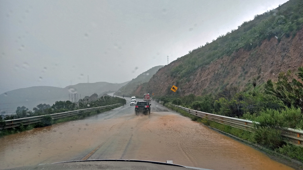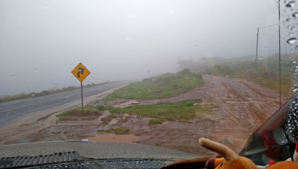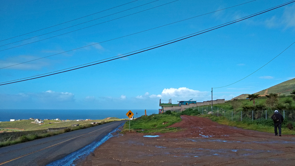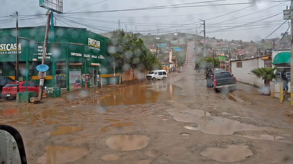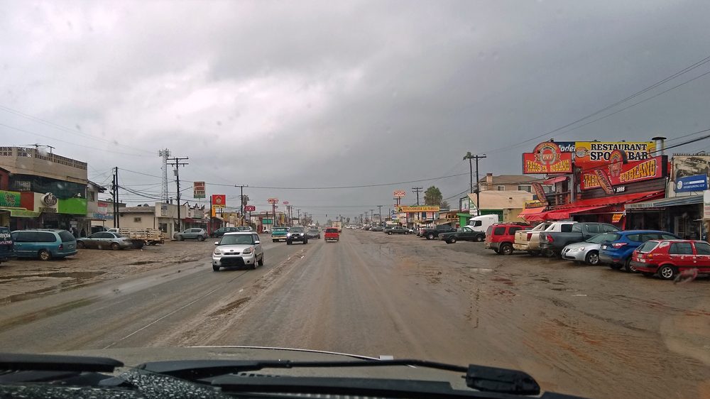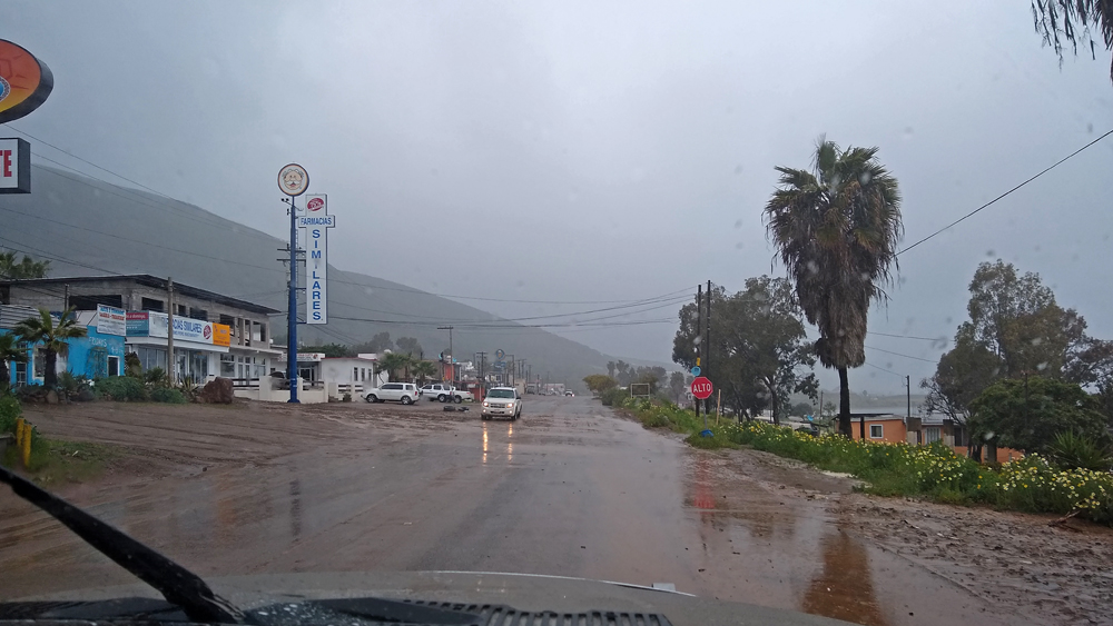 Die Fahrt von San Quintín nach La Bufadora ist dann sehr unschön: die Strassen durch die zahlreichen landwirtschaftlichen Ansiedlungen (hier ist das Gegend mit den vielen Gewächshäusern, wo u.a. all die Beeren herkommen) sind komplett verschlammt und die Strasse selbst ist an einigen Stellen überschwemmt und teilweise verschüttet. Ozy muss sich sehr konzentrieren, denn hinter jeder Ecke könnten Felsbrocken oder Strassenarbeiter, die diese wegzuräumen versuchen, auftauchen.