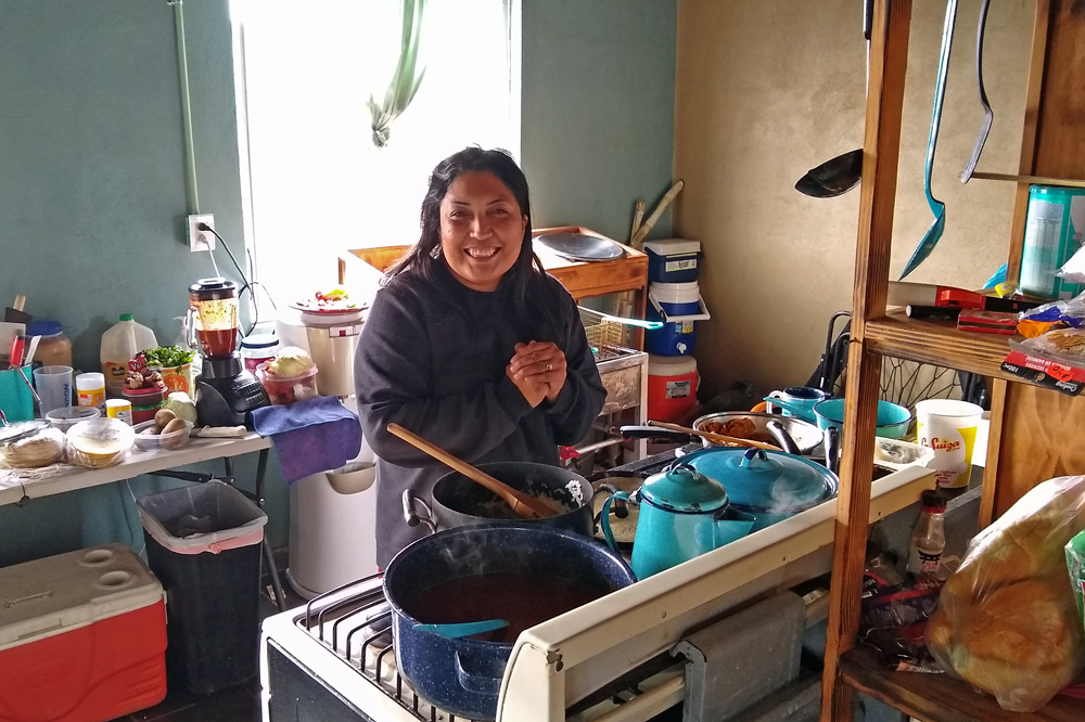 Als wir endlich in La Bufadora ankommen, sieht man auch hier die Spuren der starken Niederschläge. Wir sind ziemlich erschöpft und das Wetter ist immer noch sehr deprimierend. Wir halten beim Campo 7 und ich gehe erst mal zu Fuss zur benachbarten Casa 7 Cuartos, die Ricardo nun führt, da Ozy der lehmigen, rutschigen Zufahrt nicht traut. Ich finde Ricardo und Eliz und sie meinen, doch, doch, da könne man schon zufahren (wir hatten uns schon beim Campo 7 wegen des Übernachtens erkundigt, doch die wollen nun 400 Pesos «für bis zu 4 Personen». Wir sind aber nur zwei und der Platz sieht eher schlimmer aus als letztes Mal…). Zum Glück kommt gleich ein Getränkehändler mit seinem Lastwagen, der Ricardo neue Vorräte bringt (er hat auch einen kleinen Laden). Ozy kann sehen, dass der Untergrund nach der schlimmen Stelle am Anfang besser wird und fährt dann in den Innenhof der Casa, wo wir über Nacht stehenbleiben dürfen. Wir freuen uns sehr, Ricardo und Eliz zu sehen und sie laden uns spontan zum Abendessen ein. Eliz kocht ausgezeichnete Picadillo und Bonito Machaca und wir verbringen einen netten Abend, auf Spanisch und mit unseren Händen kommunizierend (Duolingo ist ja ganz nett, aber die Übung fehlt…).