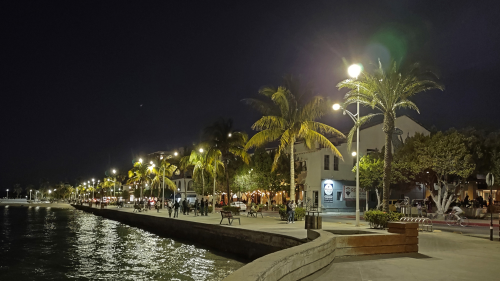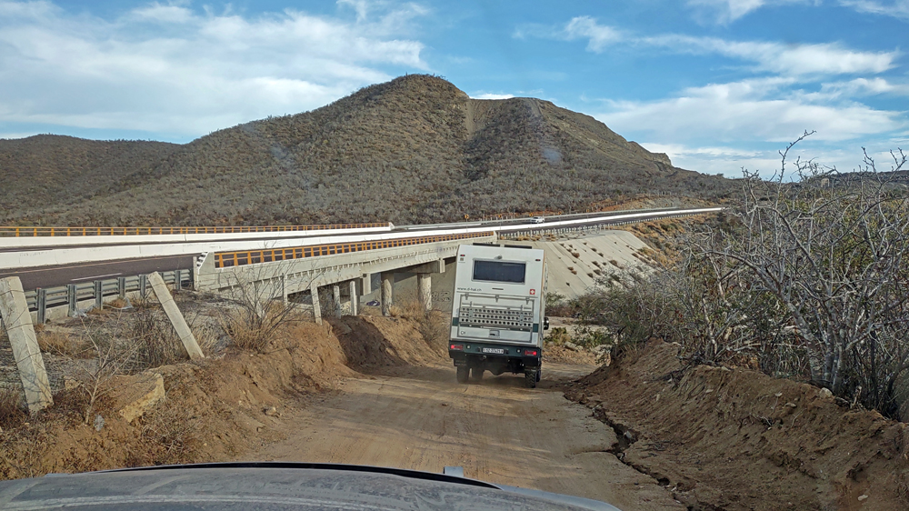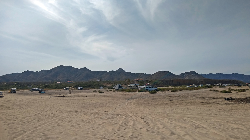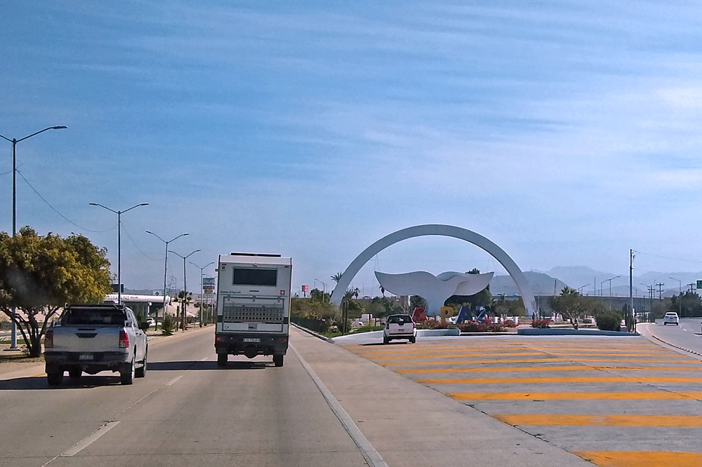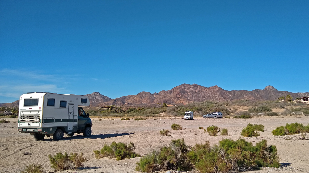 Kurz vor La Ribera treffen wir Annens nochmals zum gemeinsamen Reifen-Aufpumpen, denn ab hier ist die Strasse wieder geteert. Die Fahrt geht bald noch etwas flotter voran, denn wenig später treffen wir beim Ort mit dem klingenden Namen Colonia María Sandéz Viuda de González wieder auf die MEX-1, die uns zuerst nach Los Barriles an der Küste und von da in zahlreichen Kurven durch die nördlichen Ausläufer der Sierra de la Laguna nach La Paz führt. Wir müssen uns erst wieder ans dortige Verkehrschaos gewöhnen, das durch grosse Baustellen nicht gerade besser wird, und uns einen (wie wir feststellen sehr ungünstigen Weg) zu unserem Übernachtungsplatz suchen.