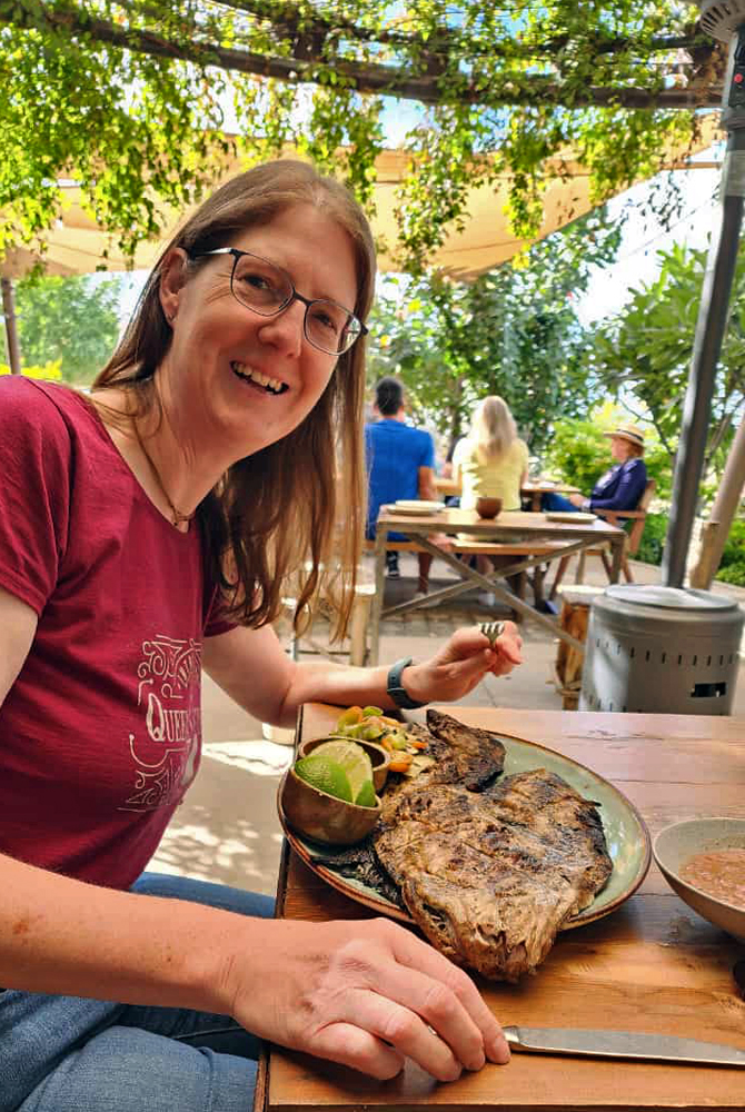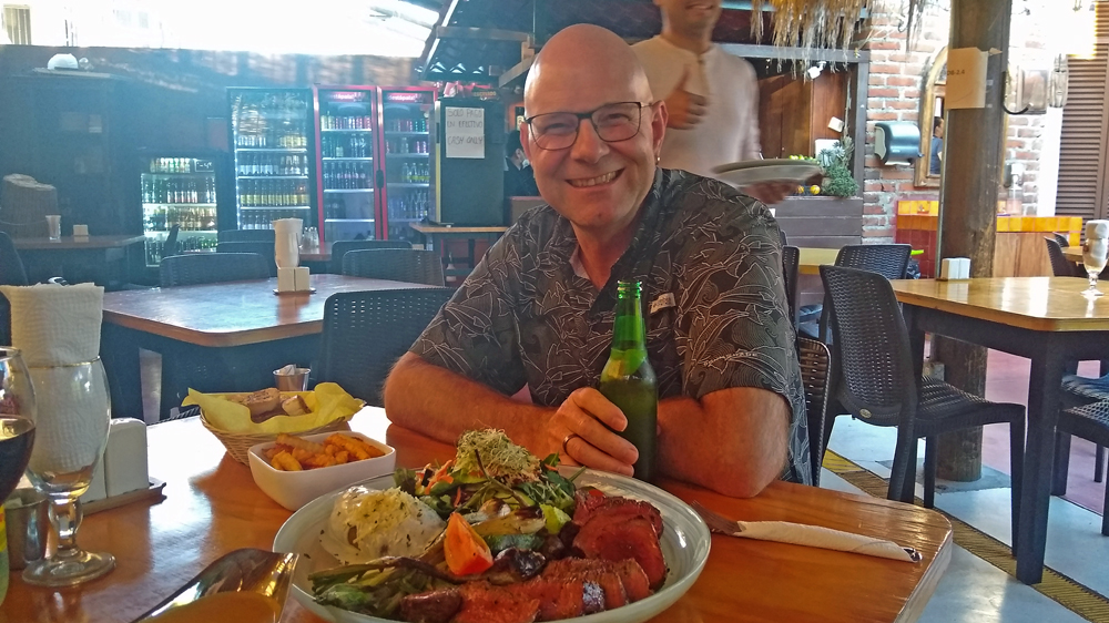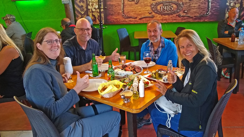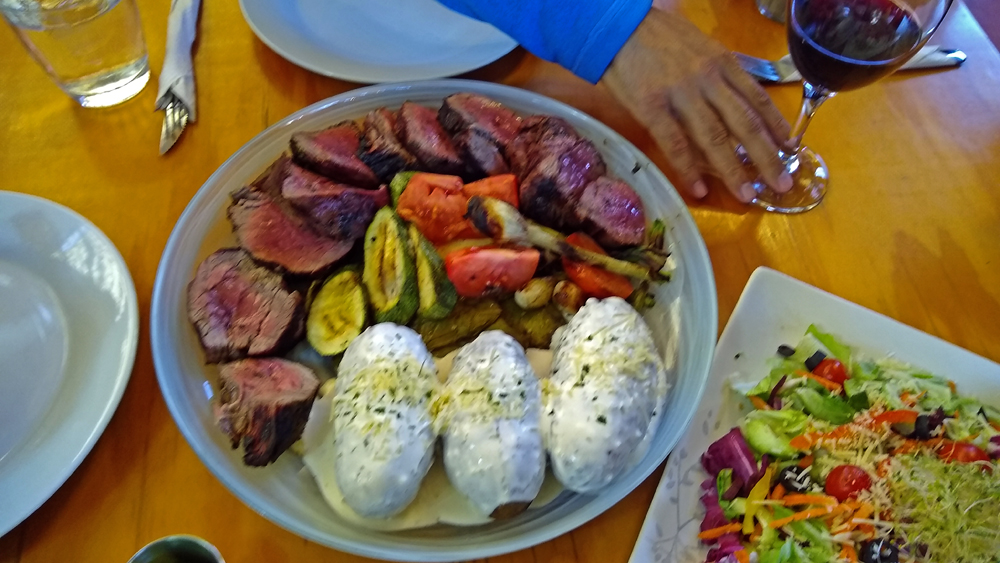 Unser Favorit ist allerdings der El Mezquite Grill, den uns Sibylle und Hermann angegeben haben, die den Platz, wenn ich mich richtig erinnere, wiederum von der Overlander-Familie «Meat around the World» hatten – da kann ja nichts schiefgehen! Und richtig: wir bekommen hier das beste Chateaubriand EVER! Das Gericht gibt es für zwei, drei oder vier Personen und das für umgerechnet CHF 25.- / Person! Es war so gut, dass wir am letzten Abend gleich nochmals dorthin gegangen sind… (die übrigen Gerichte sind übrigens auch gut, wie uns Claudia und Thomas versichert haben).