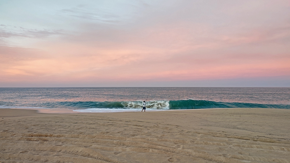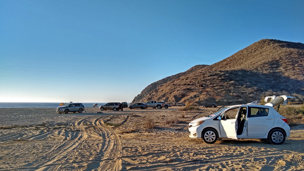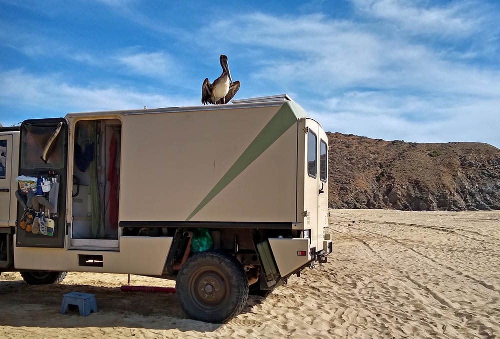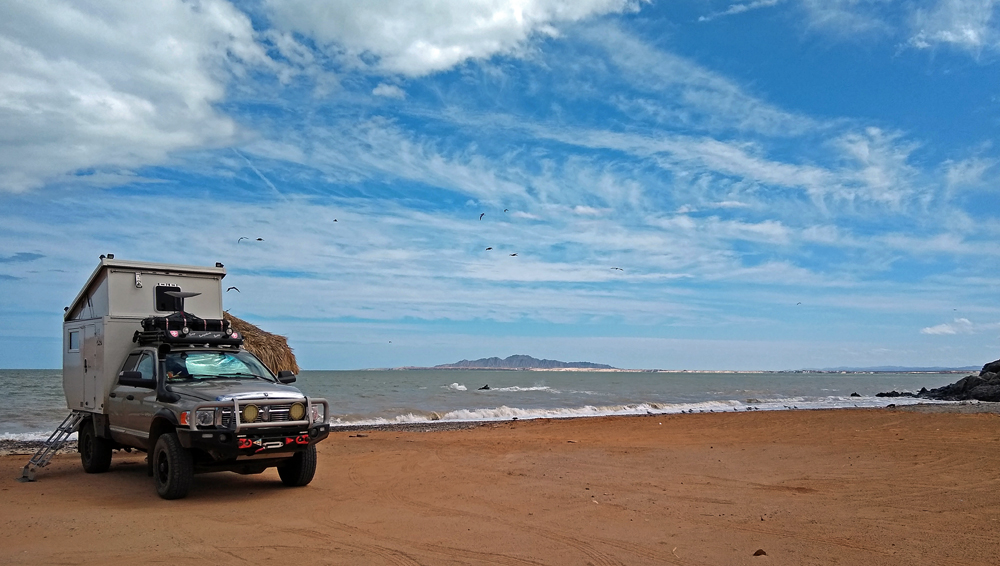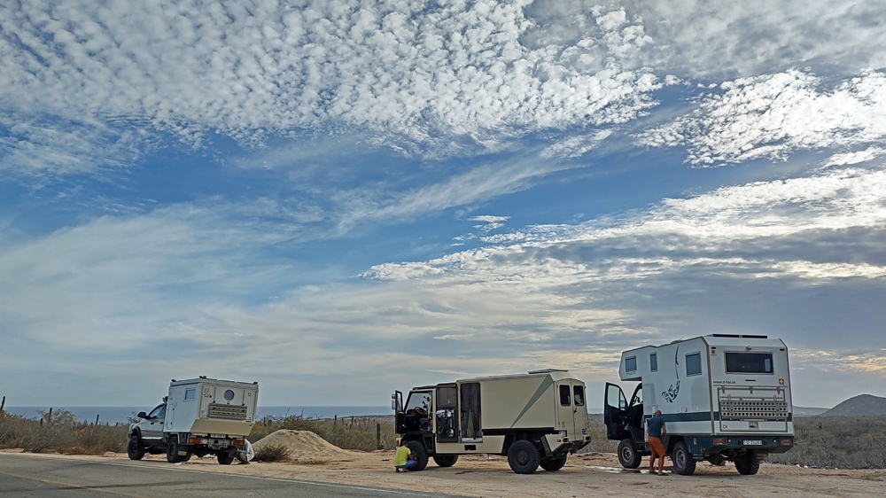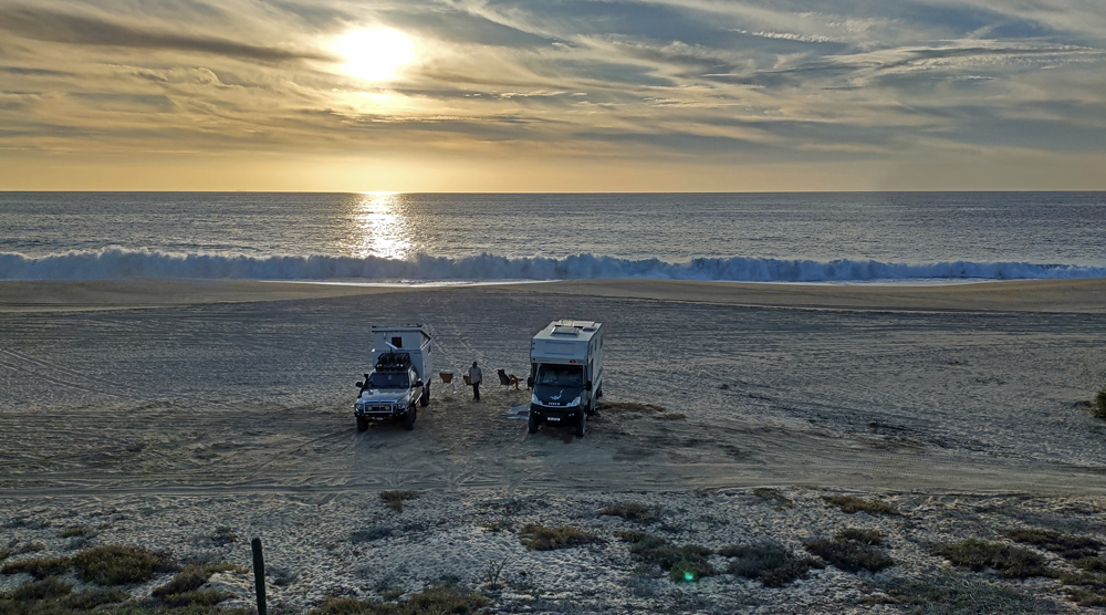 Nun noch im südlich von Todos Santos gelegenen El Pescadero Wasser fassen (Sibylle und Hermann gehen auch noch in die sehr schick aussehende Agricole Cooperativa einkaufen) und dann geht’s endgültig an den Strand! Annens führen uns zur Playa Jimi (auch Playa Las Tinajas), wo wir die nächste Woche verbringen. Bald stossen Claudia und Thomas dazu und dann auch noch Jürgen, den Sibylle und Hermann bereits von früher kennen. Es hat noch einige wenige andere ausländische Camper, aber nicht sehr viele. Während des Tages und vor allem am Wochenende kommen Einheimische, um zu fischen oder den Strand zu geniessen. Wir amüsieren uns, dass sie ihre Autos ganz, ganz nahe und sogar zwischen unseren Gefährten parken. Allerdings gibt es hier auch nicht allzu viele Stellen, wo der Sand wirklich tragfähig ist…