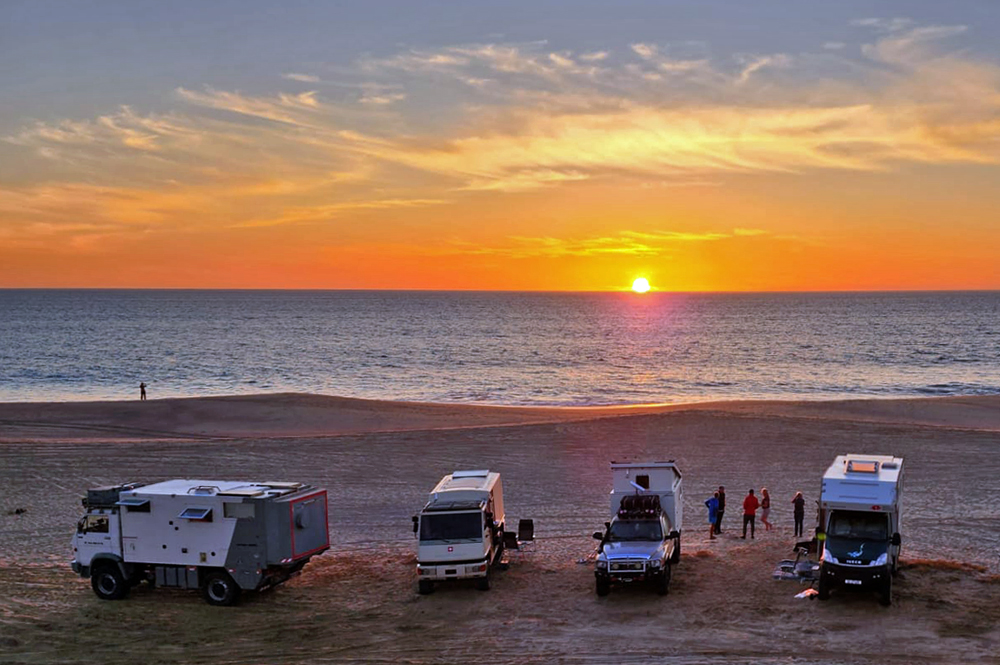 Zum Baden scheint uns dieser Strand eher nicht geeignet (ein deutscher Nachbar wagt sich manchmal rein), aber dafür scheinen mir die Wellen hier besonders schön zu sein. Wie sie sich auftürmen und fast durchsichtig werden, bevor sie brechen und auf den Strand donnern… Ich könnte stundenlang zusehen! Auch die Sonnenuntergänge sind einfach spektakulär und wir alle schiessen aus allen möglichen Positionen wohl Hunderte von Fotos… Das schönste ist aber, dass der Strand und die Bucht offenbar eine besonders günstige Form für die Wale haben, so dass wir zahlreiche Grauwale beobachten können, die sehr nahe an uns vorbeiziehen. Zudem springen weiter draussen die Buckelwale. Das Strandleben wird nur ein wenig durch den kalten Nordwind getrübt, der uns meist in den Windschatten eines unserer Fahrzeuge treibt. Jedoch wagen wir uns immer wieder ans Meer, besonders wenn die Wale aktiv sind.